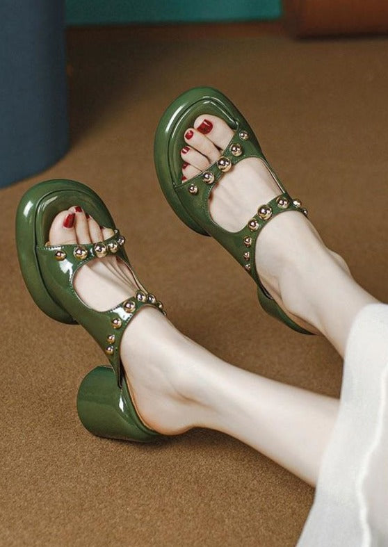 Green Faux Leather Chic Rivet Splicing Peep Toe Chunky Slide Sandals