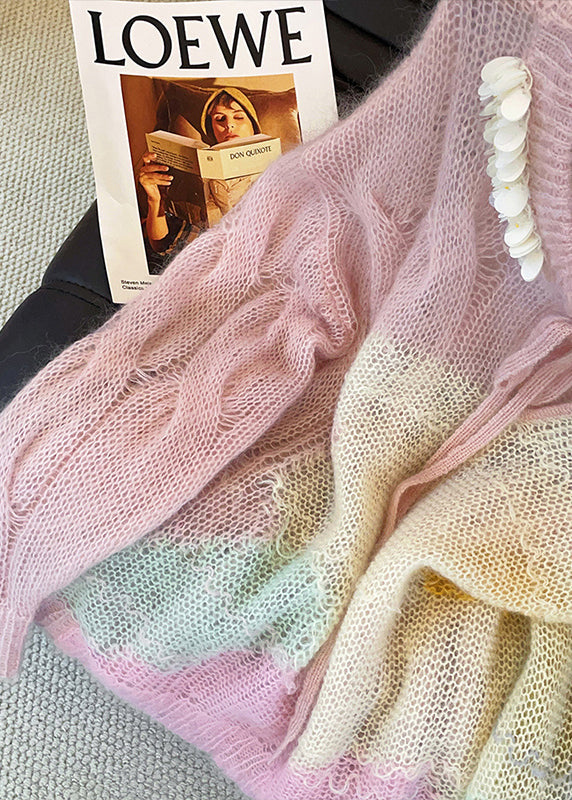 Art Gradient Color Lace Up Hollow Out Knit Top Fall
