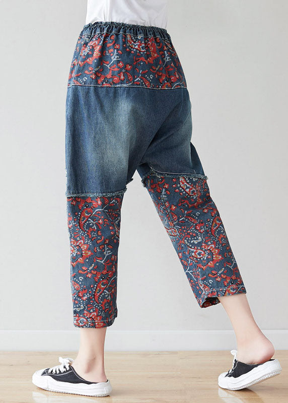 Art Blue Elastic Waist Patchwork Print Cotton Ripped Jeans Spring
