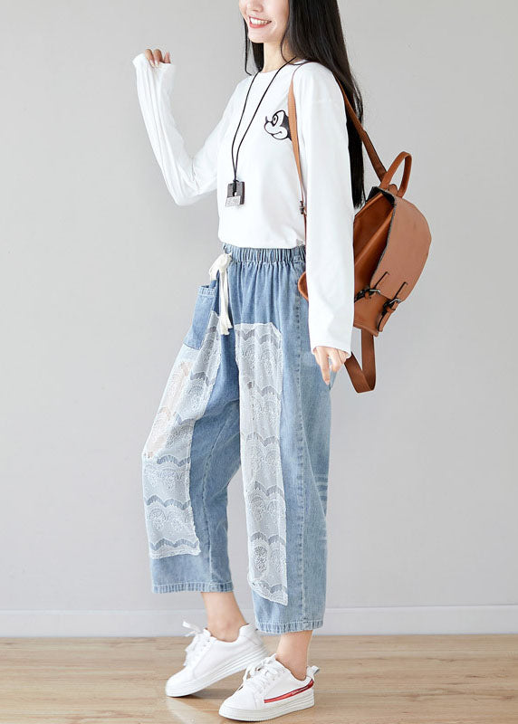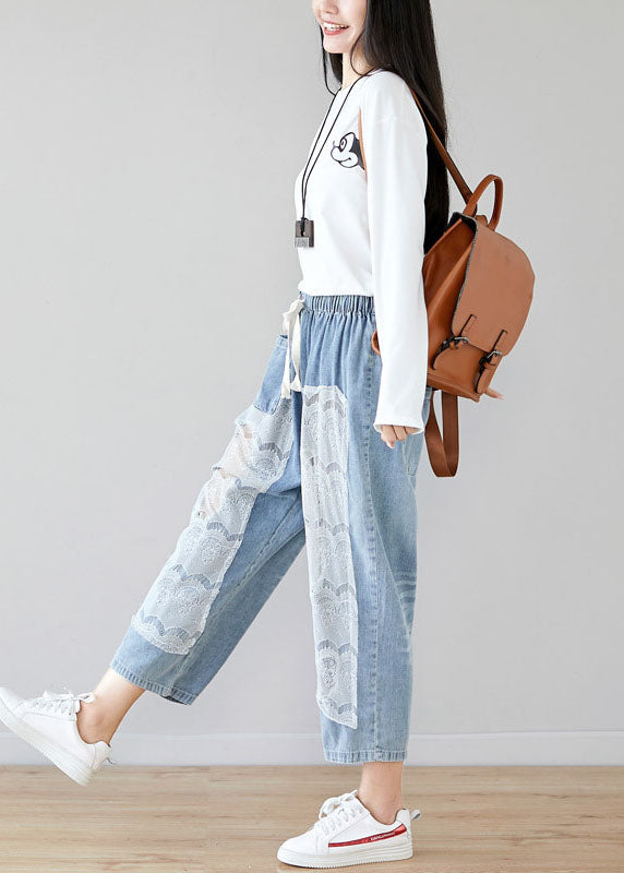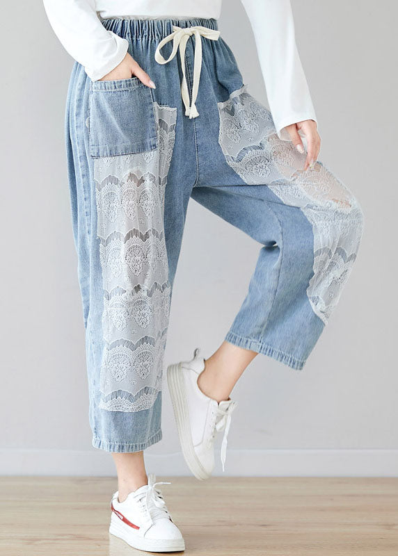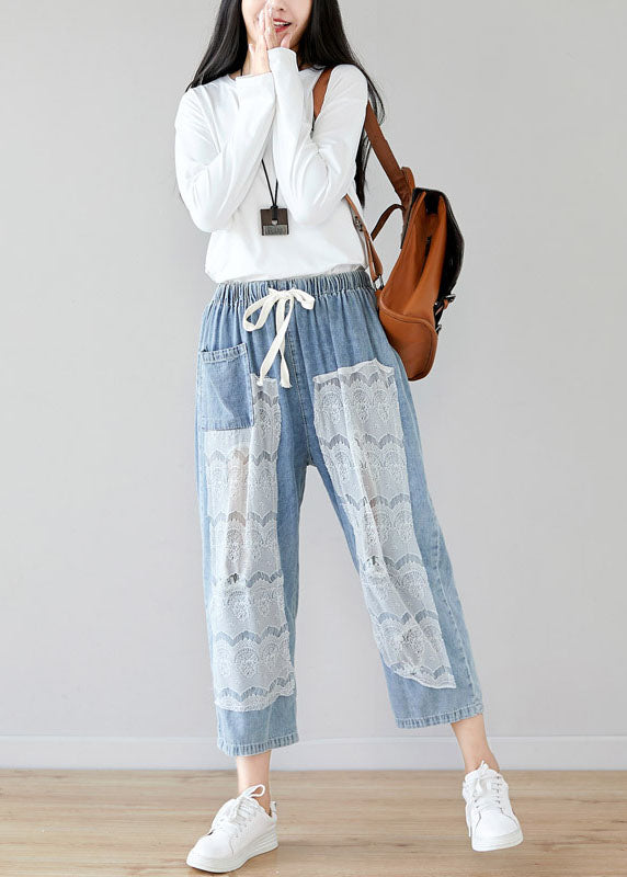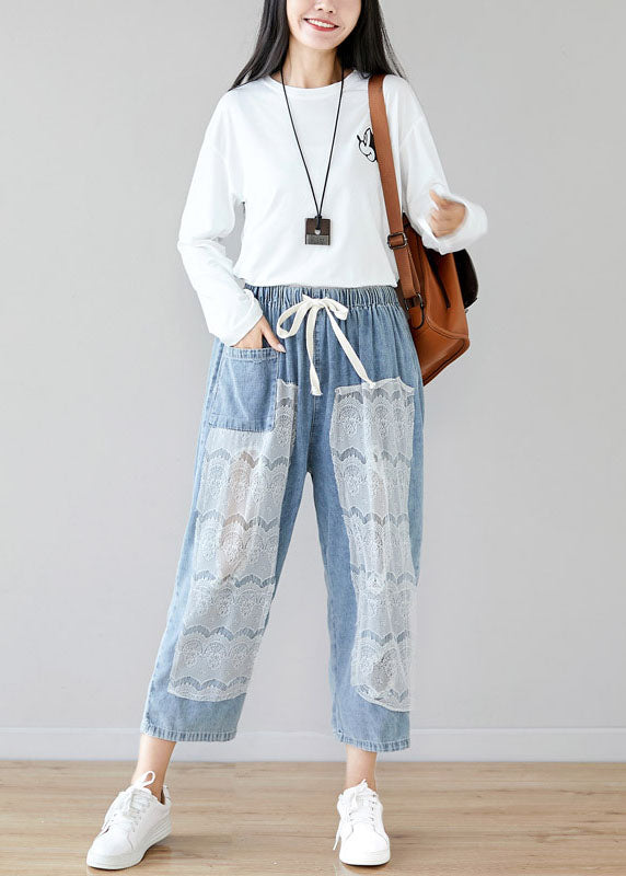 Art Light Blue Oversized Lace Patchwork Hollow Out Cotton Pants Trousers Summer