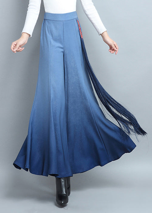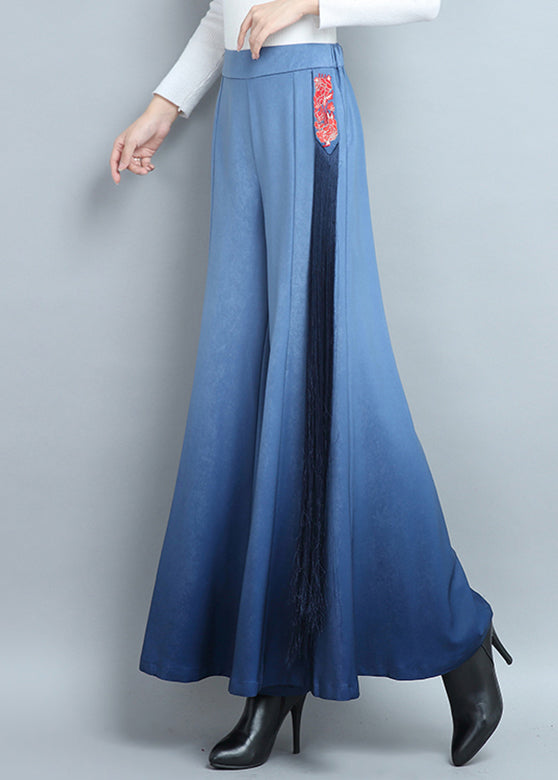 Blue Elastic Waist Cotton Wide Leg Pants Tasseled Spring