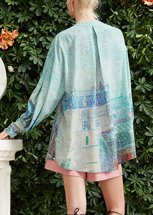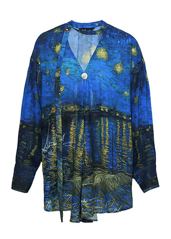Boutique Blue V Neck Print Wrinkled Shirts Long Sleeve
