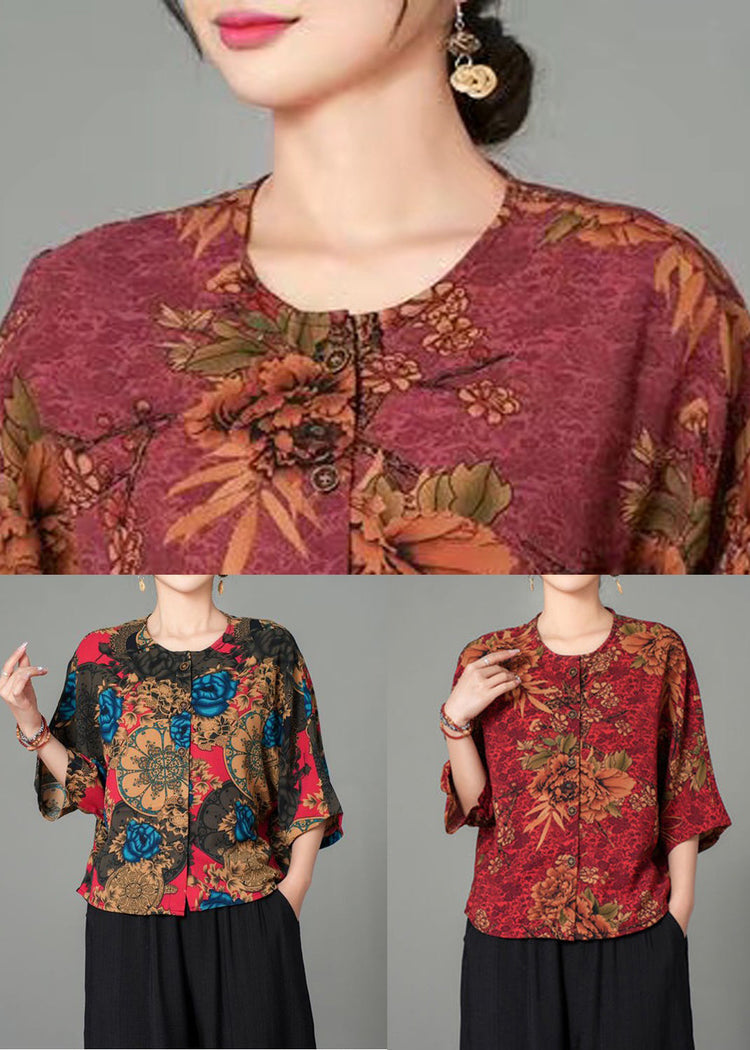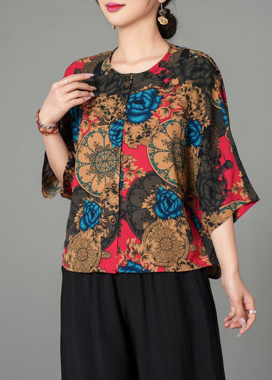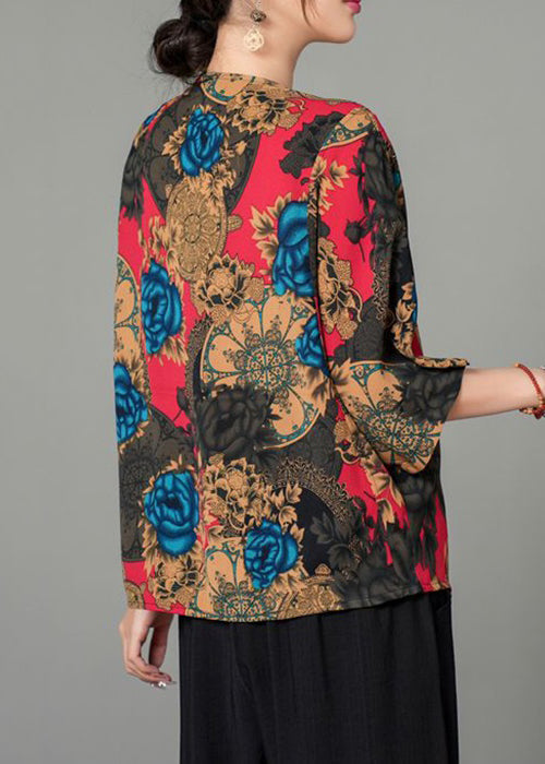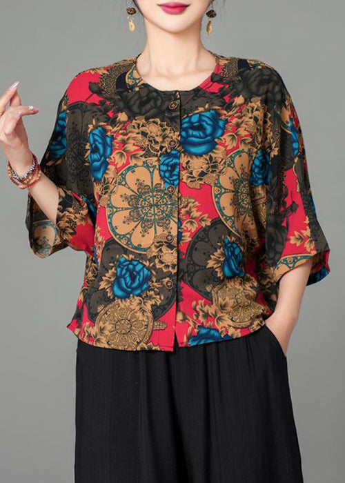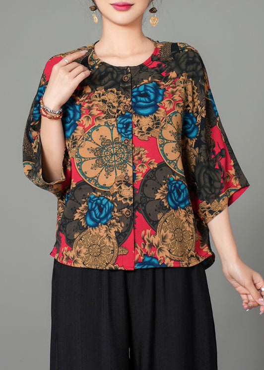 Chic Blue Button Print Cotton Blouse Bracelet Sleeve