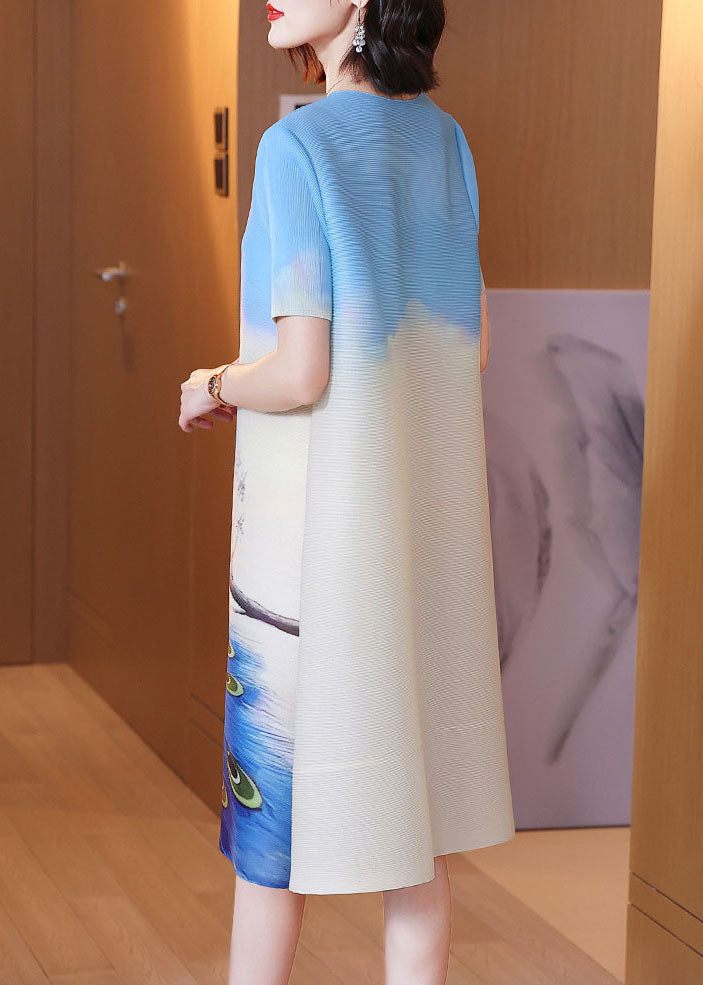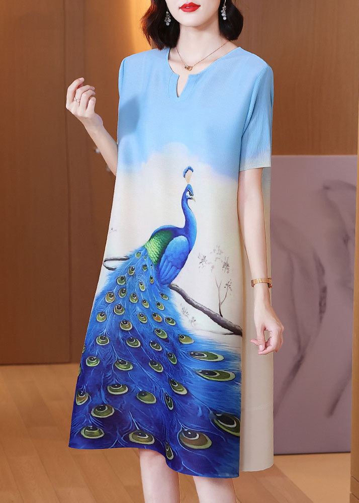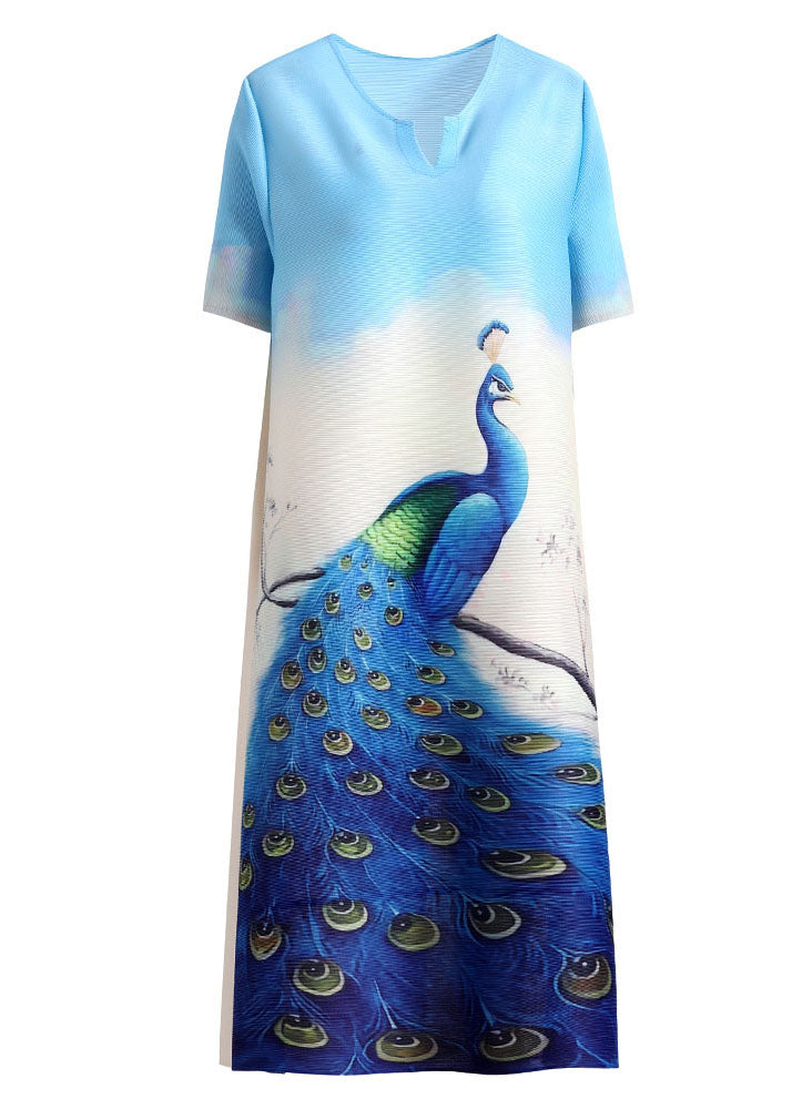 Elegant Blue O-Neck Peacock Print Silk Mid Dress Short Sleeve