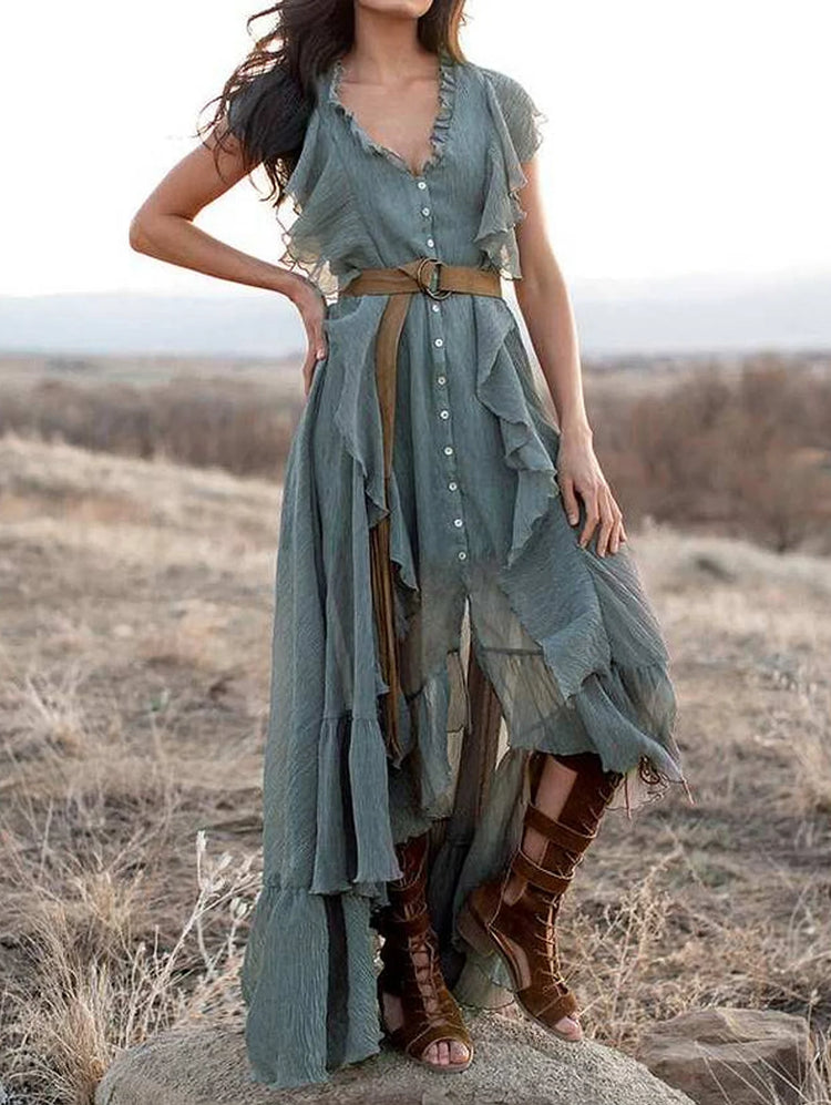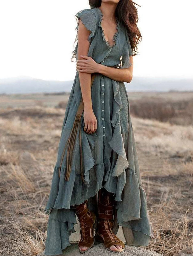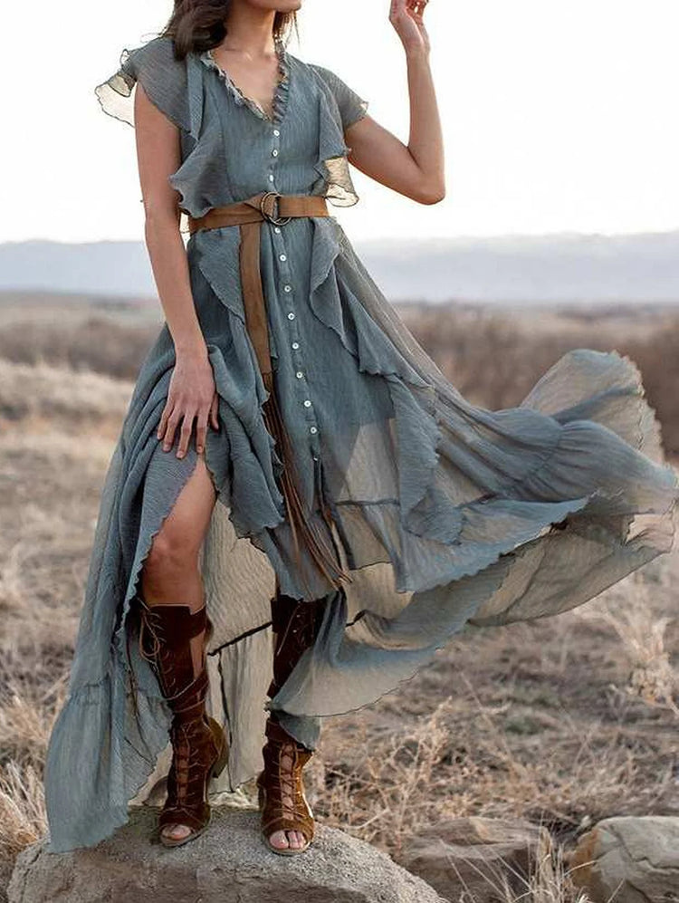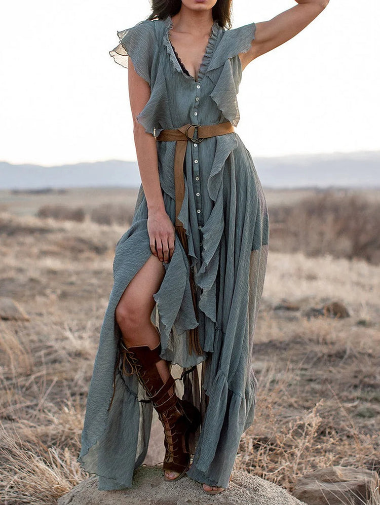 Grey Blue V Neck Button Up Ruffle Maxi Dress