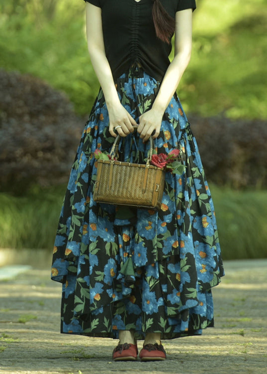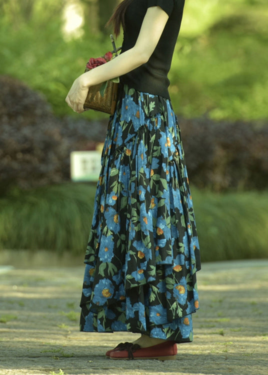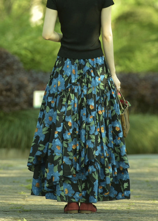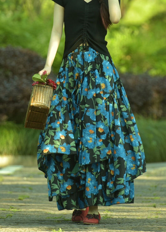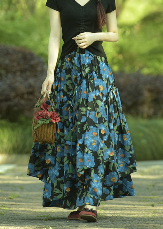 Natural Blue Wrinkled Asymmetrical Print Cotton Skirt Spring