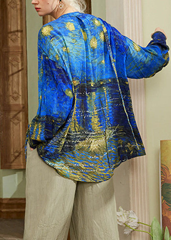 Boutique Retro Blue Asymmetrical Print Cotton Shirt Top Spring