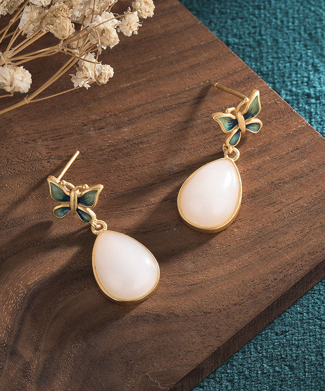 Casual Blue Ancient Gold Inlaid Jade Butterfly Water Drop Drop Earrings