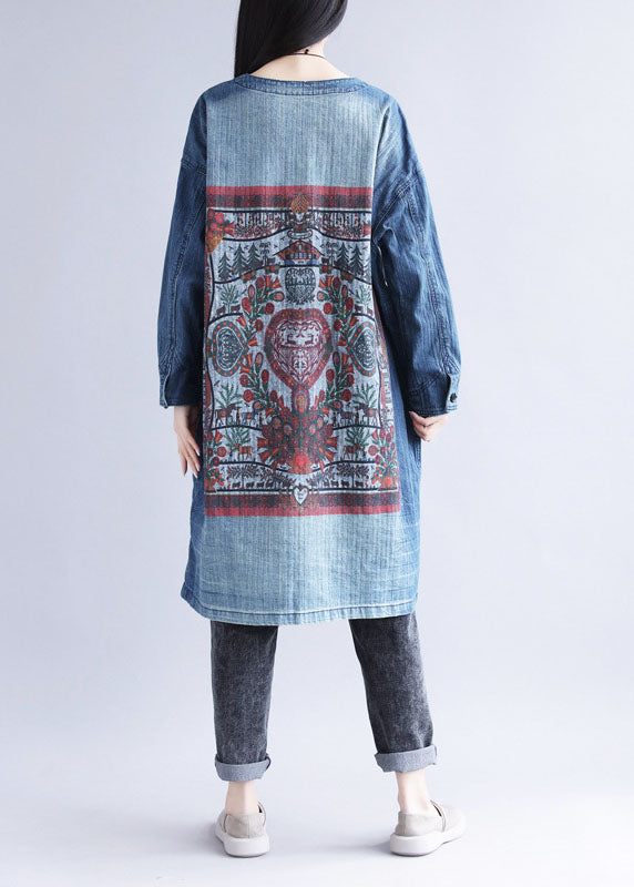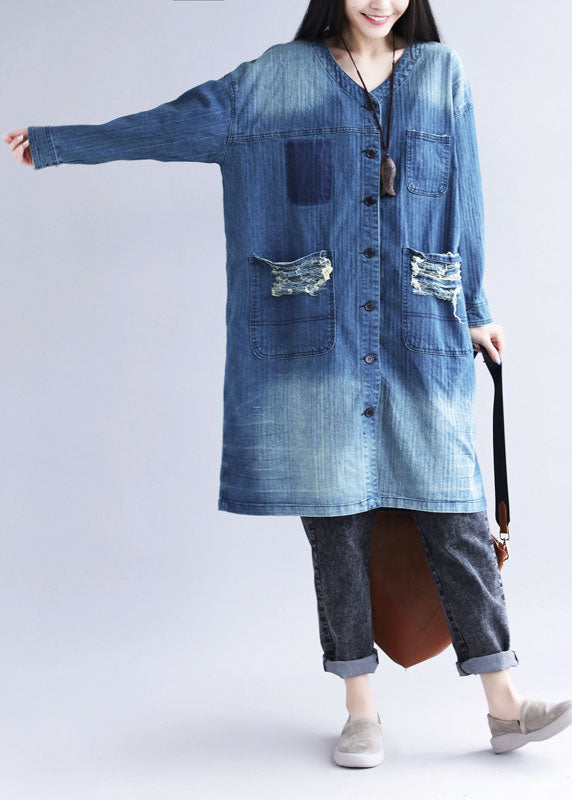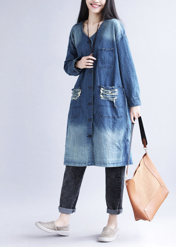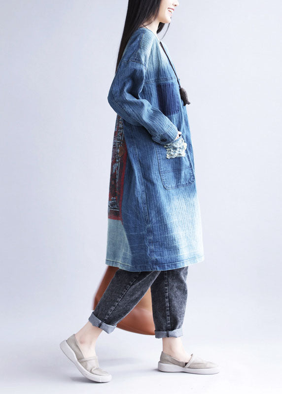 Casual Blue V Neck Ripped Pockets Print Cotton Denim Trench Spring
