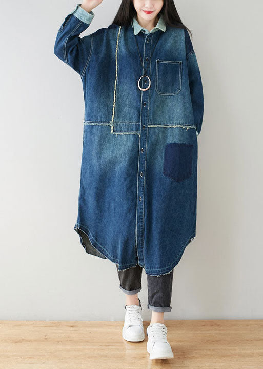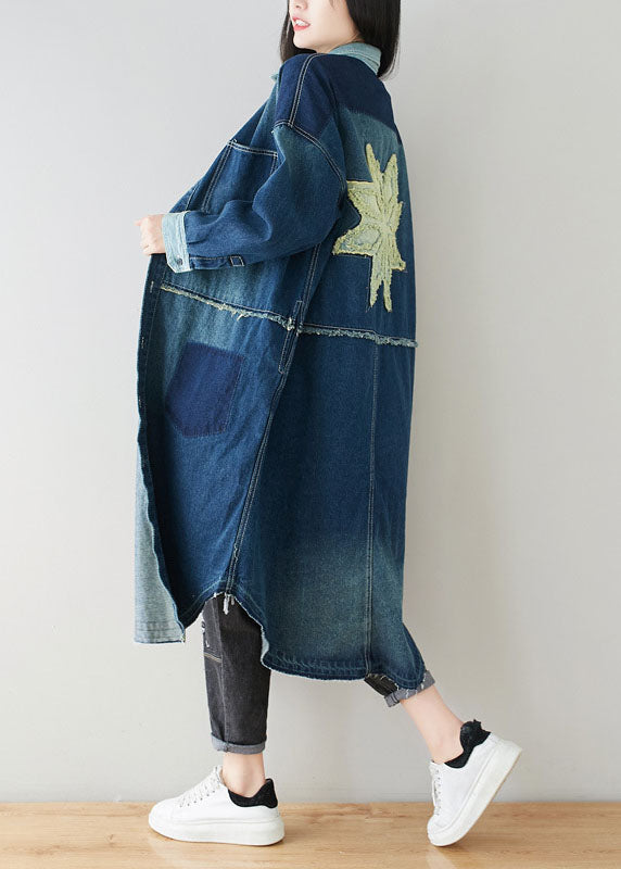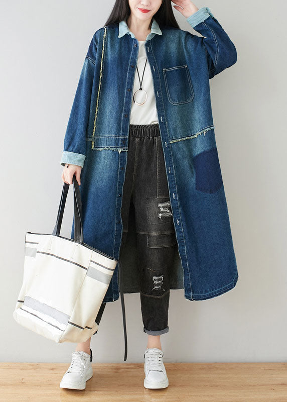 Boho Denim Blue Peter Pan Collar Patchwork Oversized Cotton Trench Spring