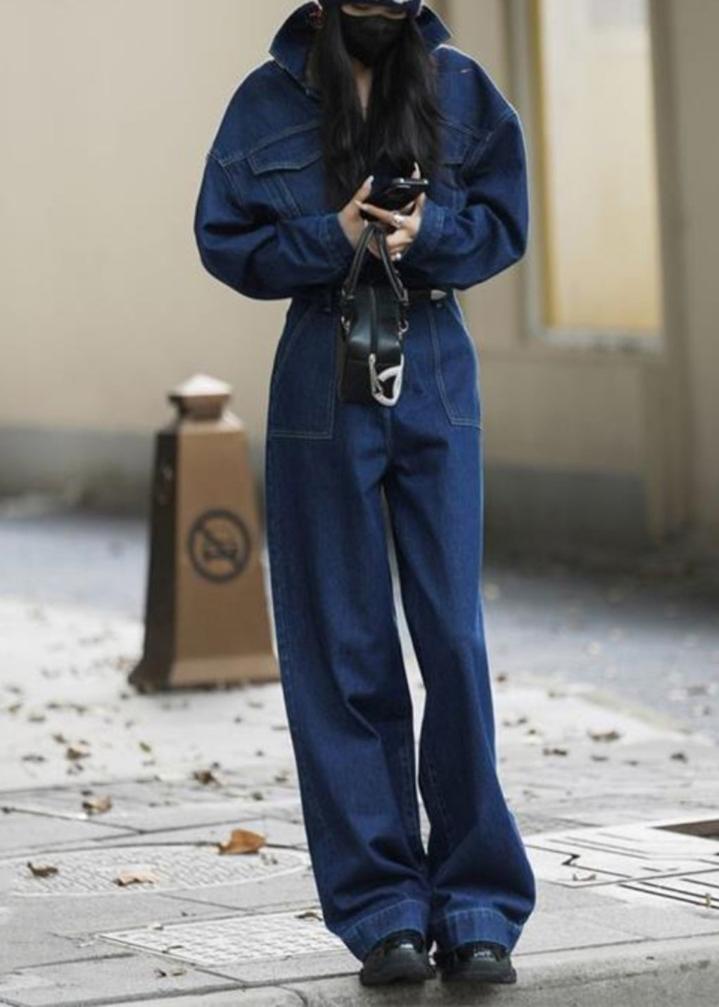 Loose Blue Peter Pan Collar Pockets High Waist Denim Jumpsuits Fall
