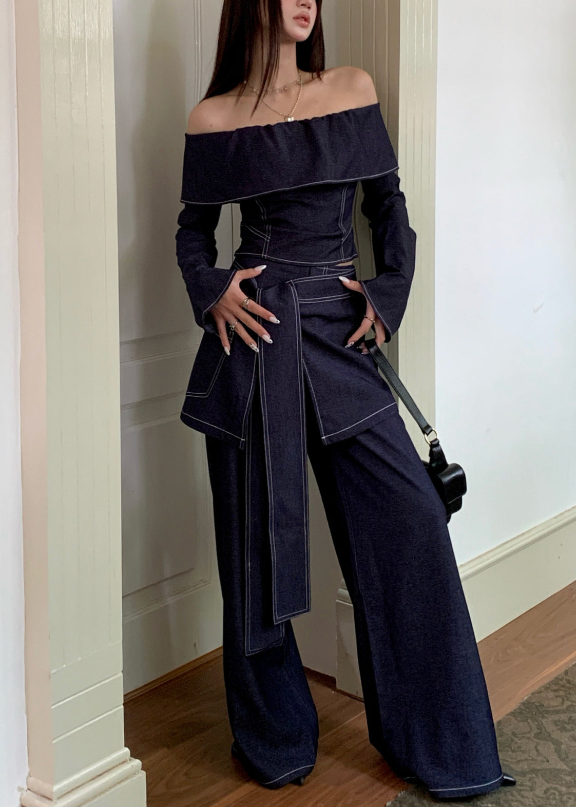 Slim Fit Blue Slash Neck Tie Waist Denim Three Pieces Set Fall