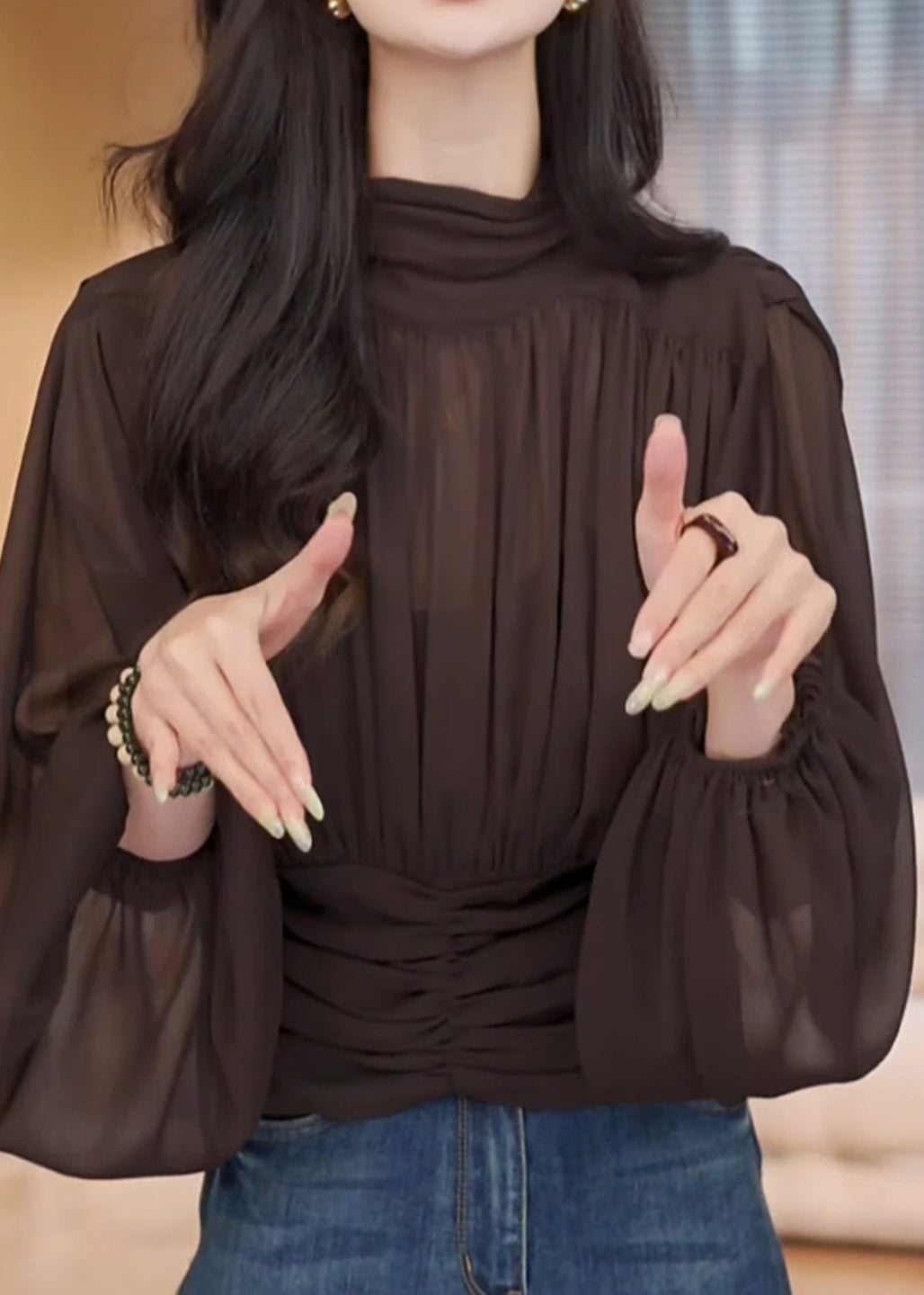 French Chocolate Stand Collar Wrinkled Chiffon Shirt Lantern Sleeve