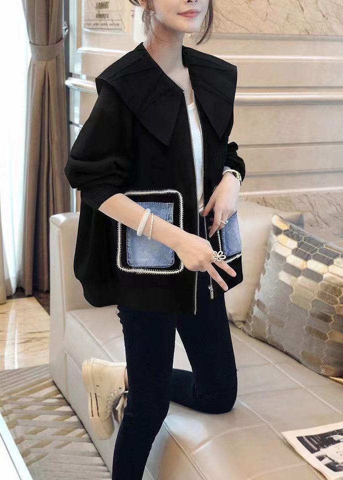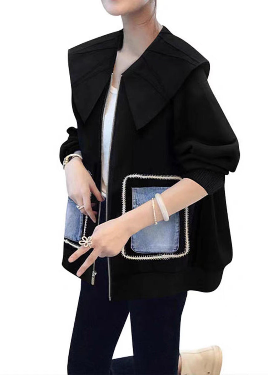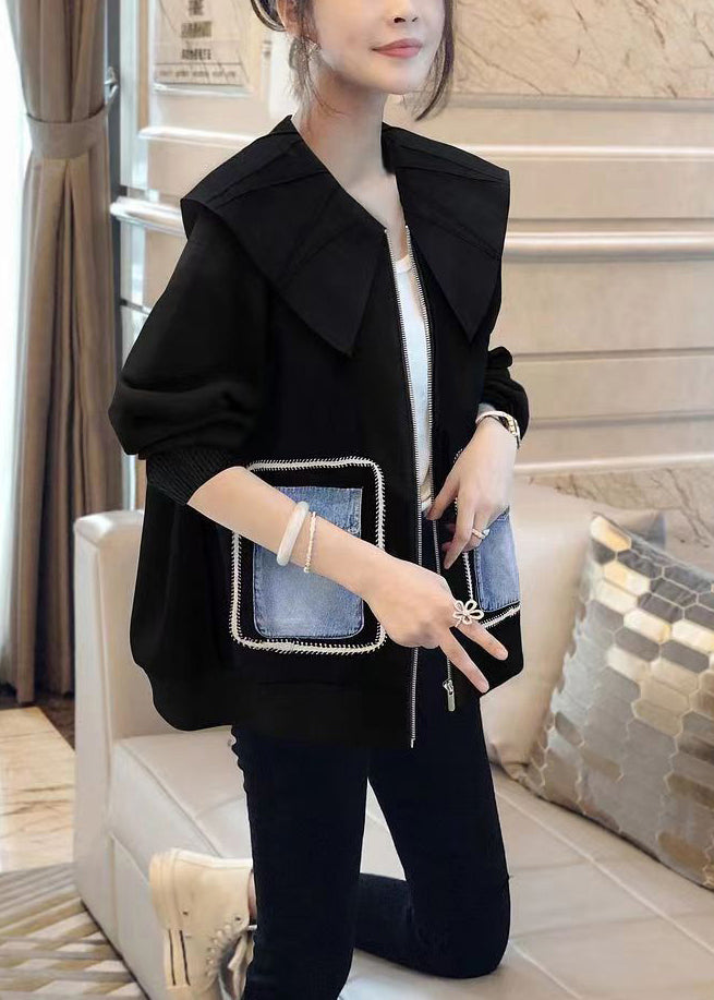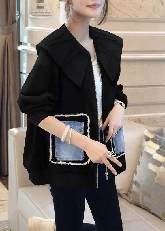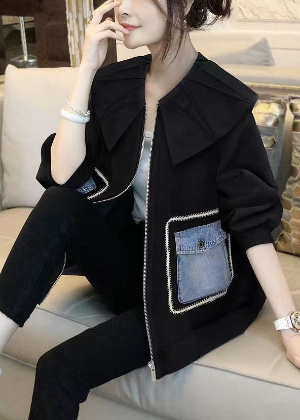 French Black Peter Pan Collar Patchwork Cotton Coats Fall