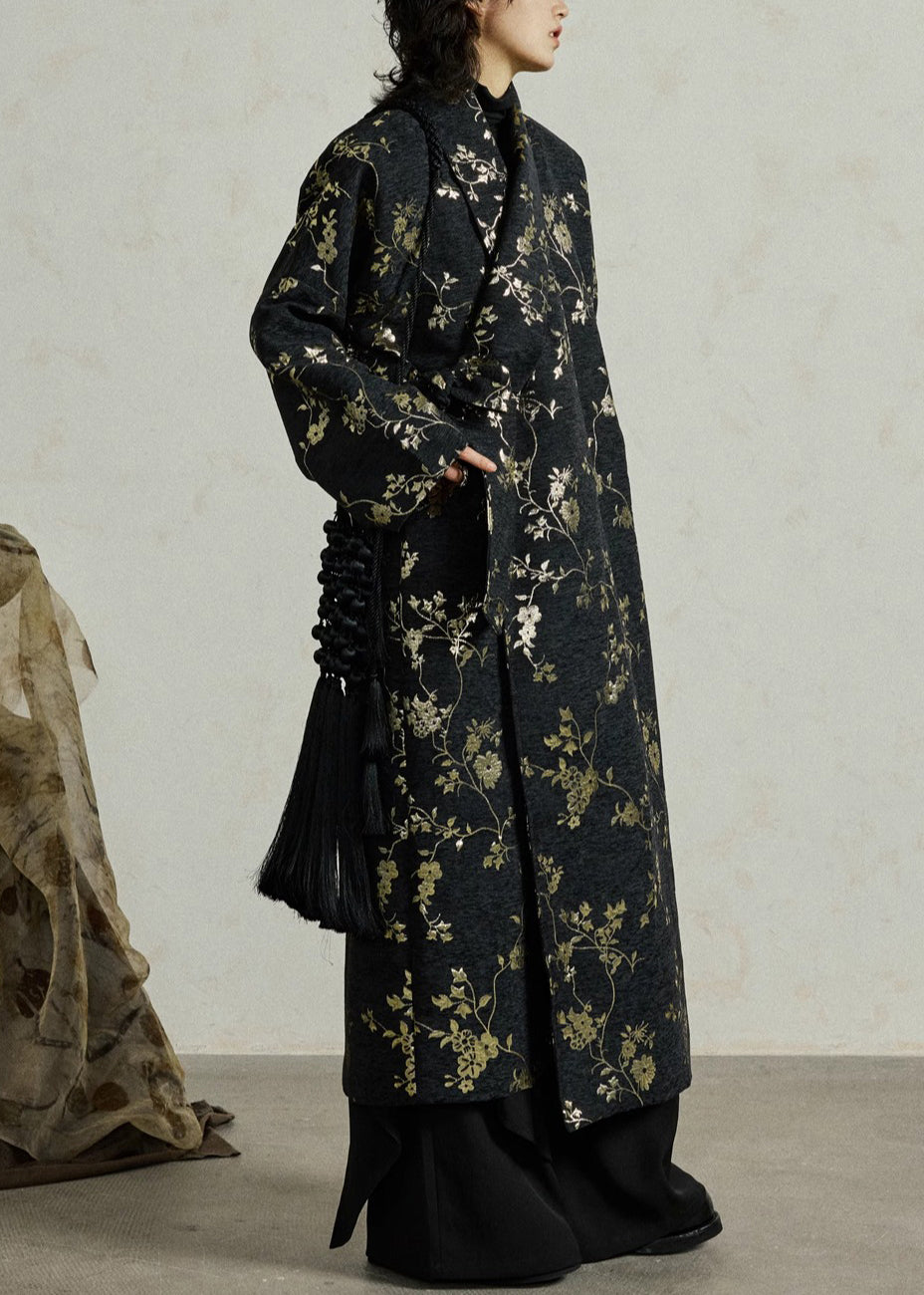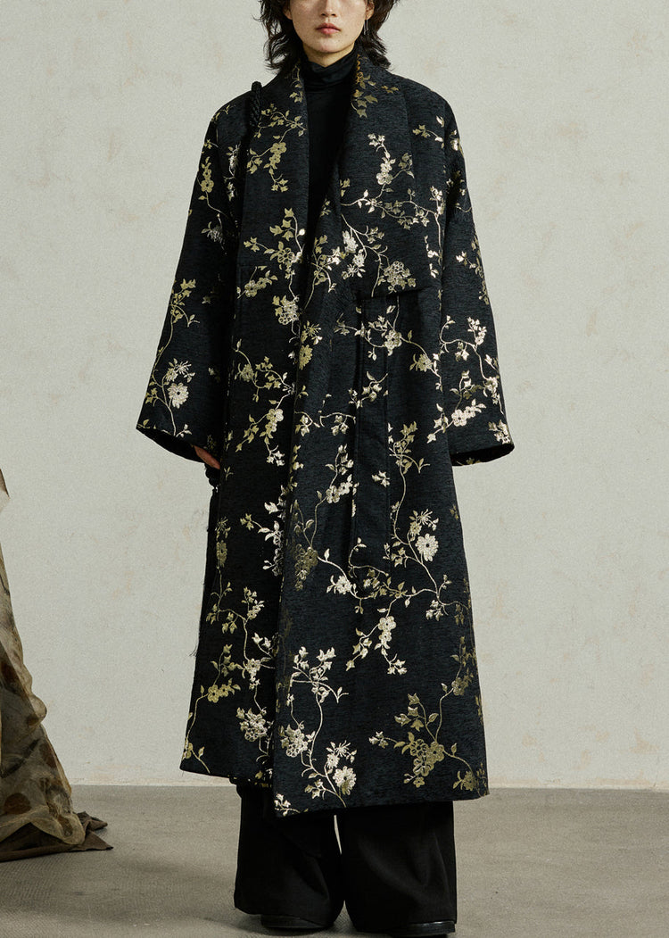 Jacquard Black Lace Up Pockets Cotton Long Coats Fall