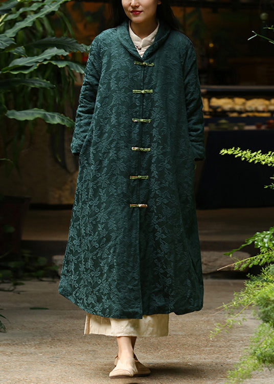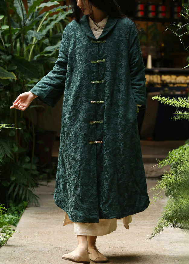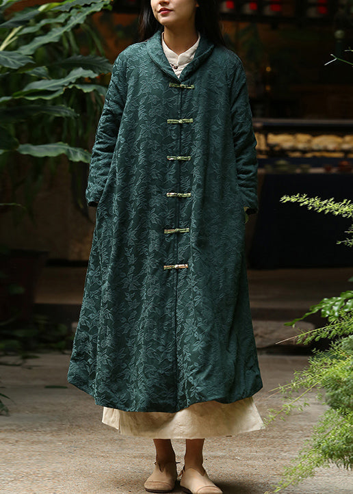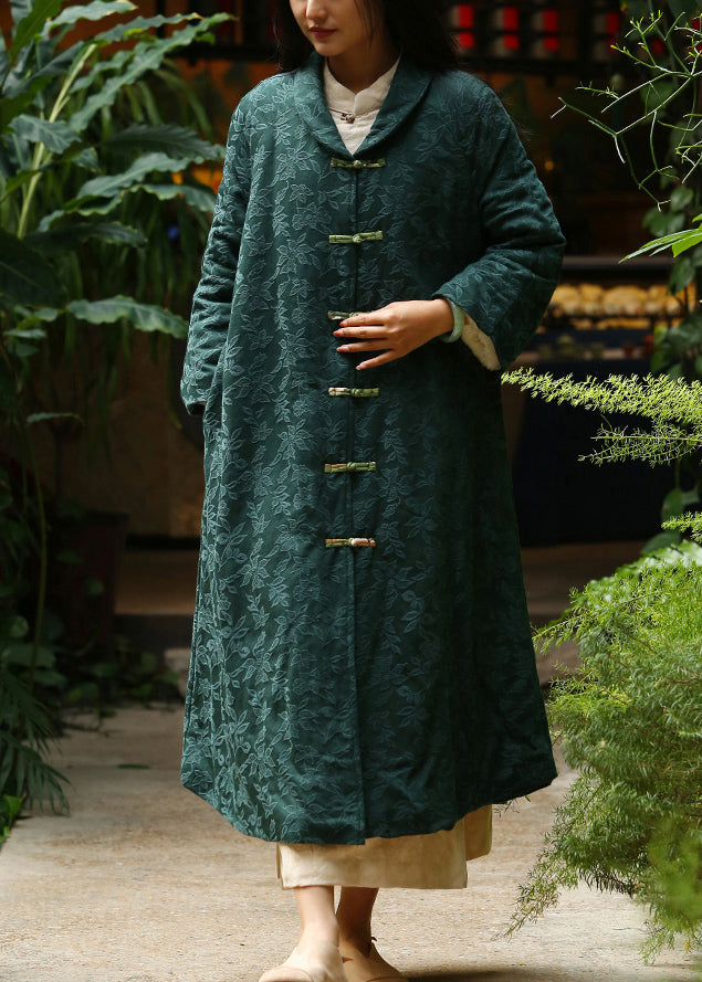 Jacquard Blackish Green Button Pockets Warm Fleece Long Coat Winter