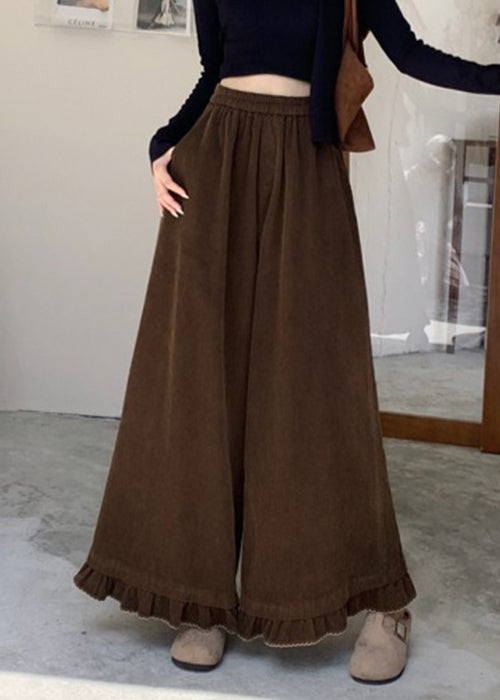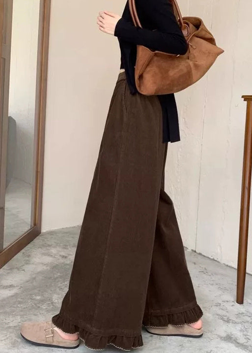 Modern Brown Ruffled Corduroy Wide Leg Pants Spring