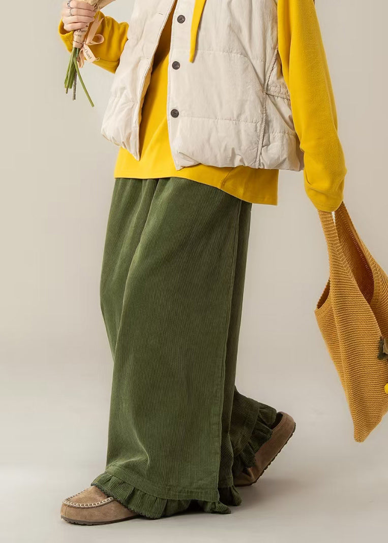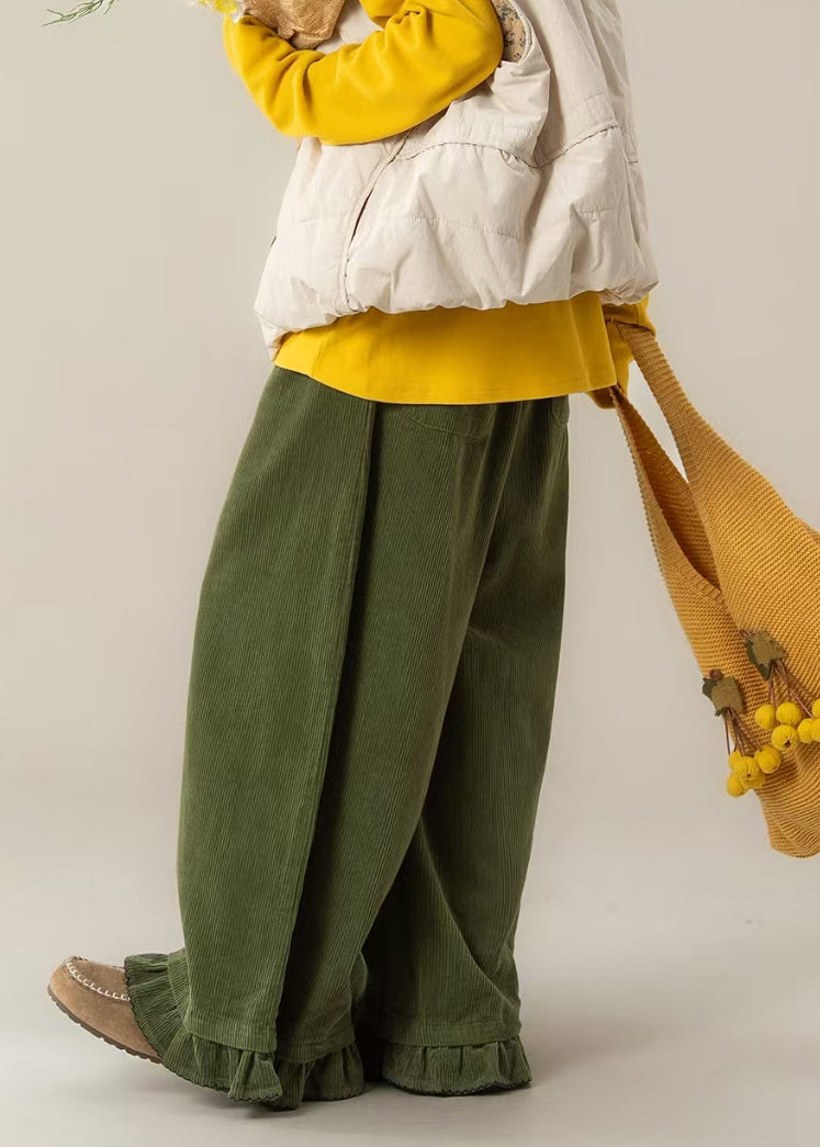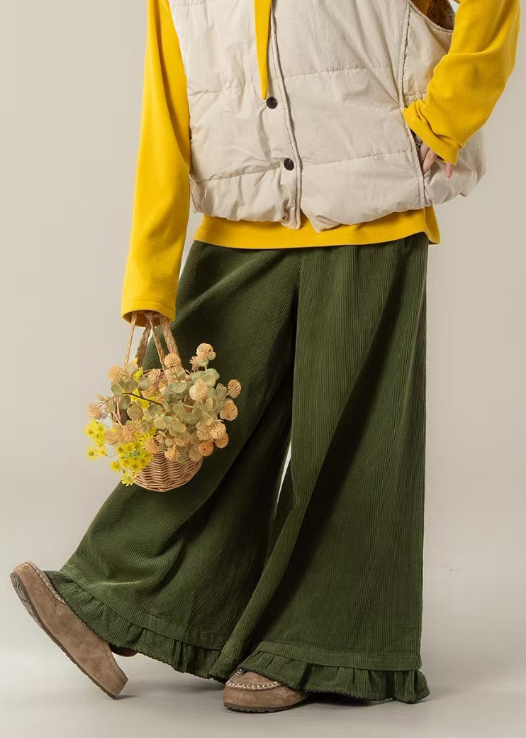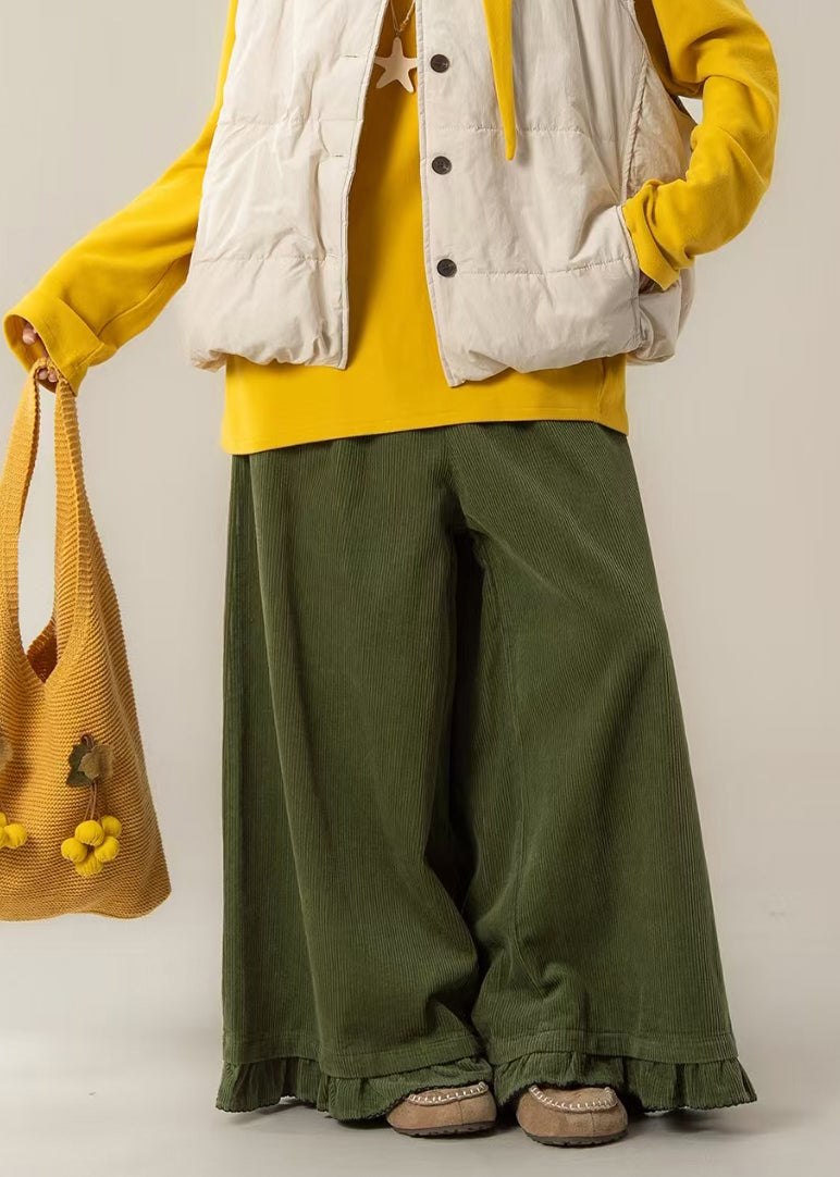 Loose Green Ruffled Elastic Waist Corduroy Wide Leg Pants Fall