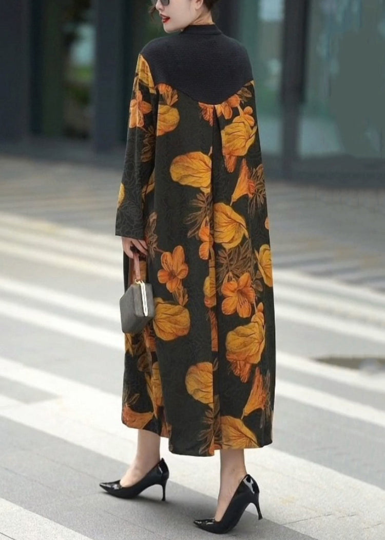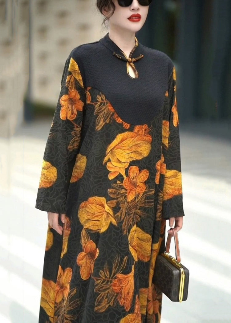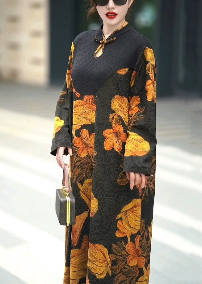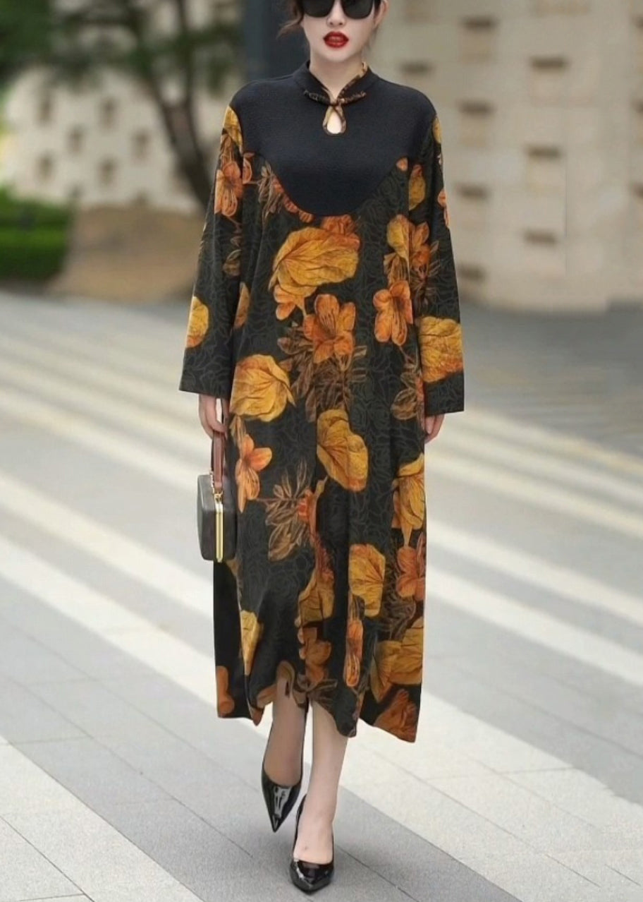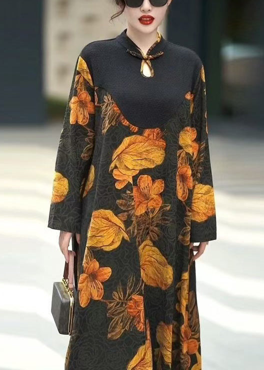 Beautiful Yellow Button Print Silk Long Dresses Fall