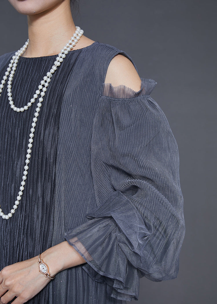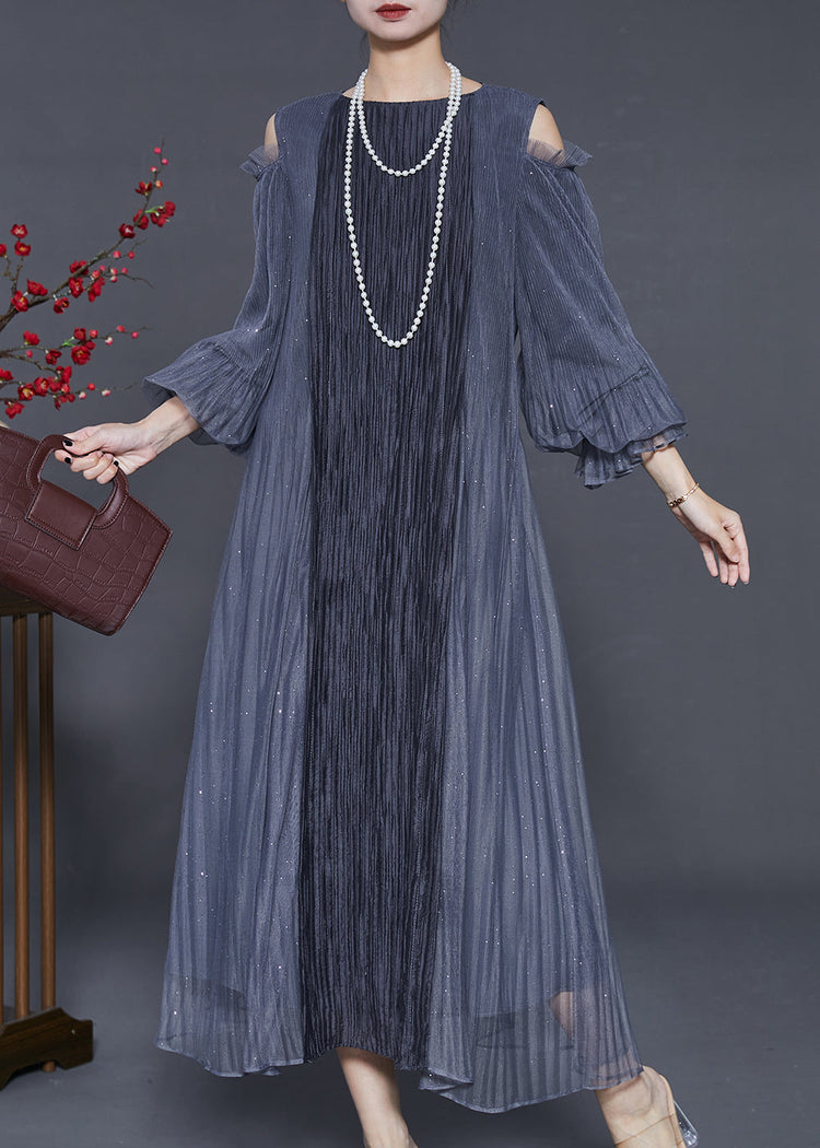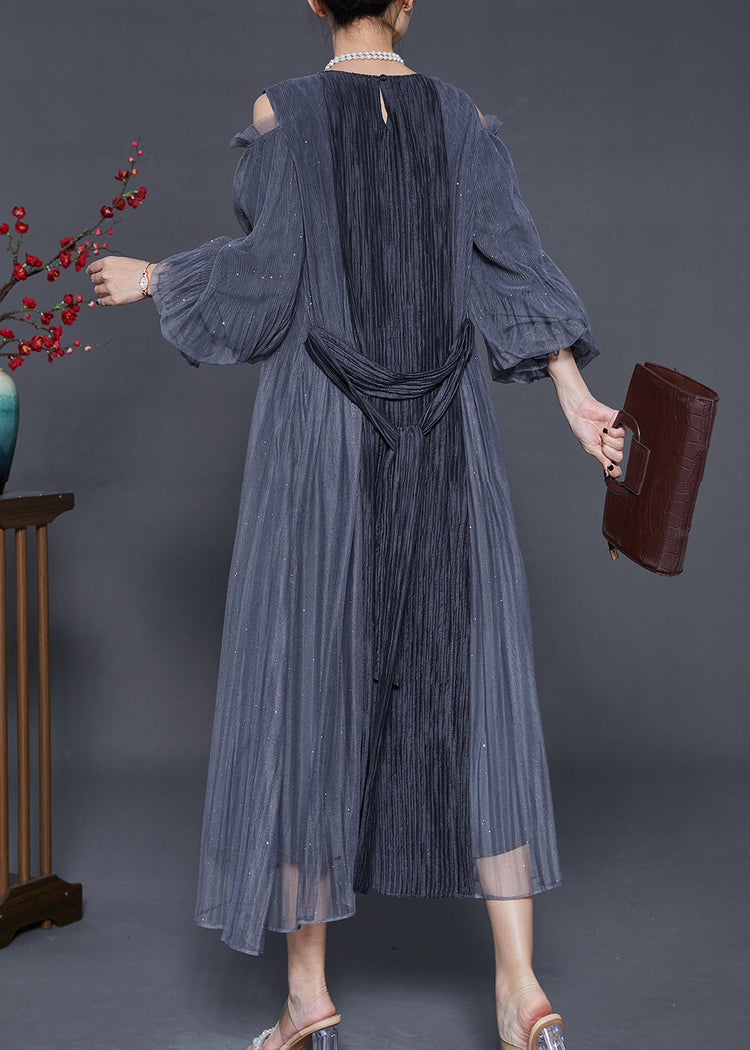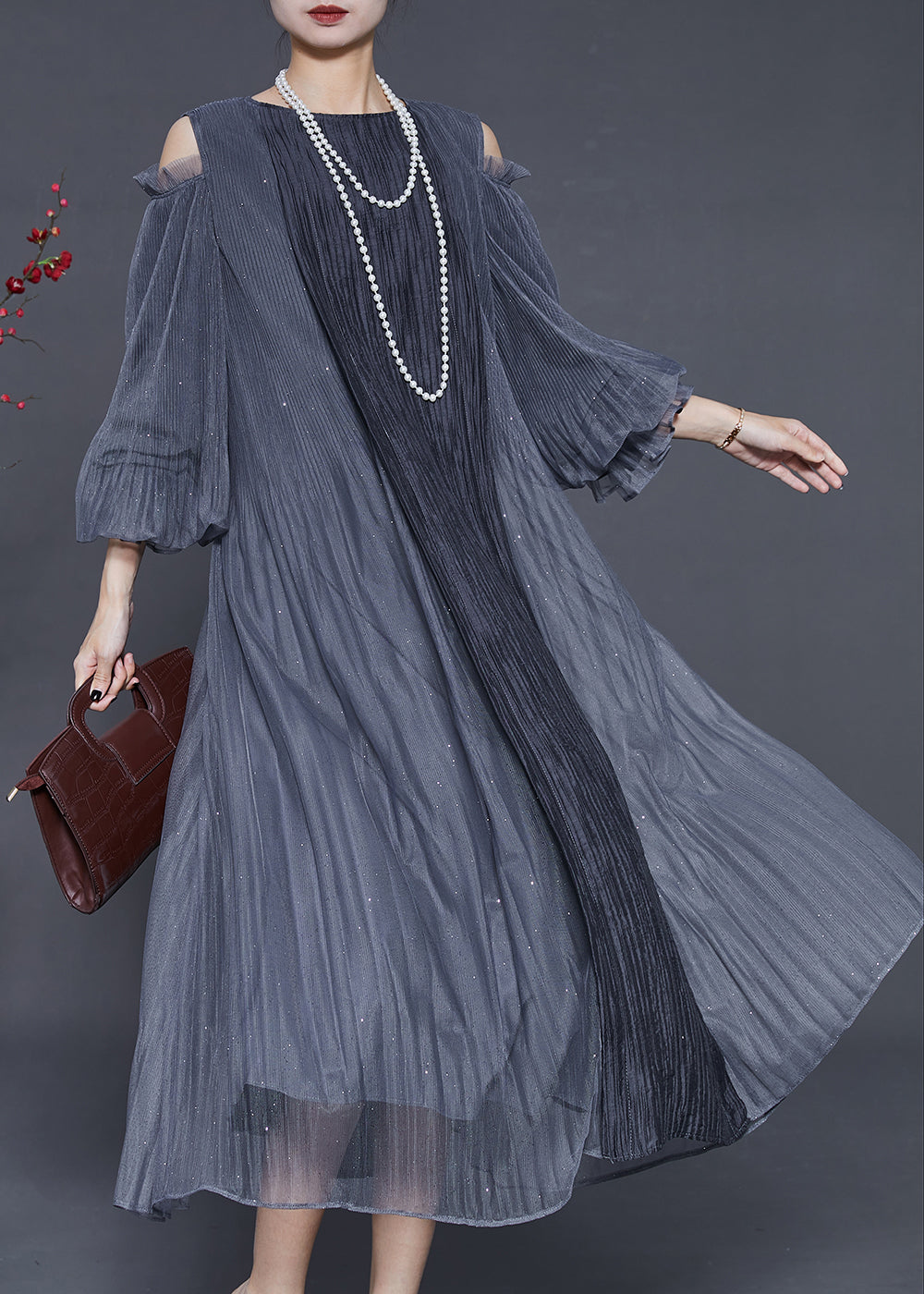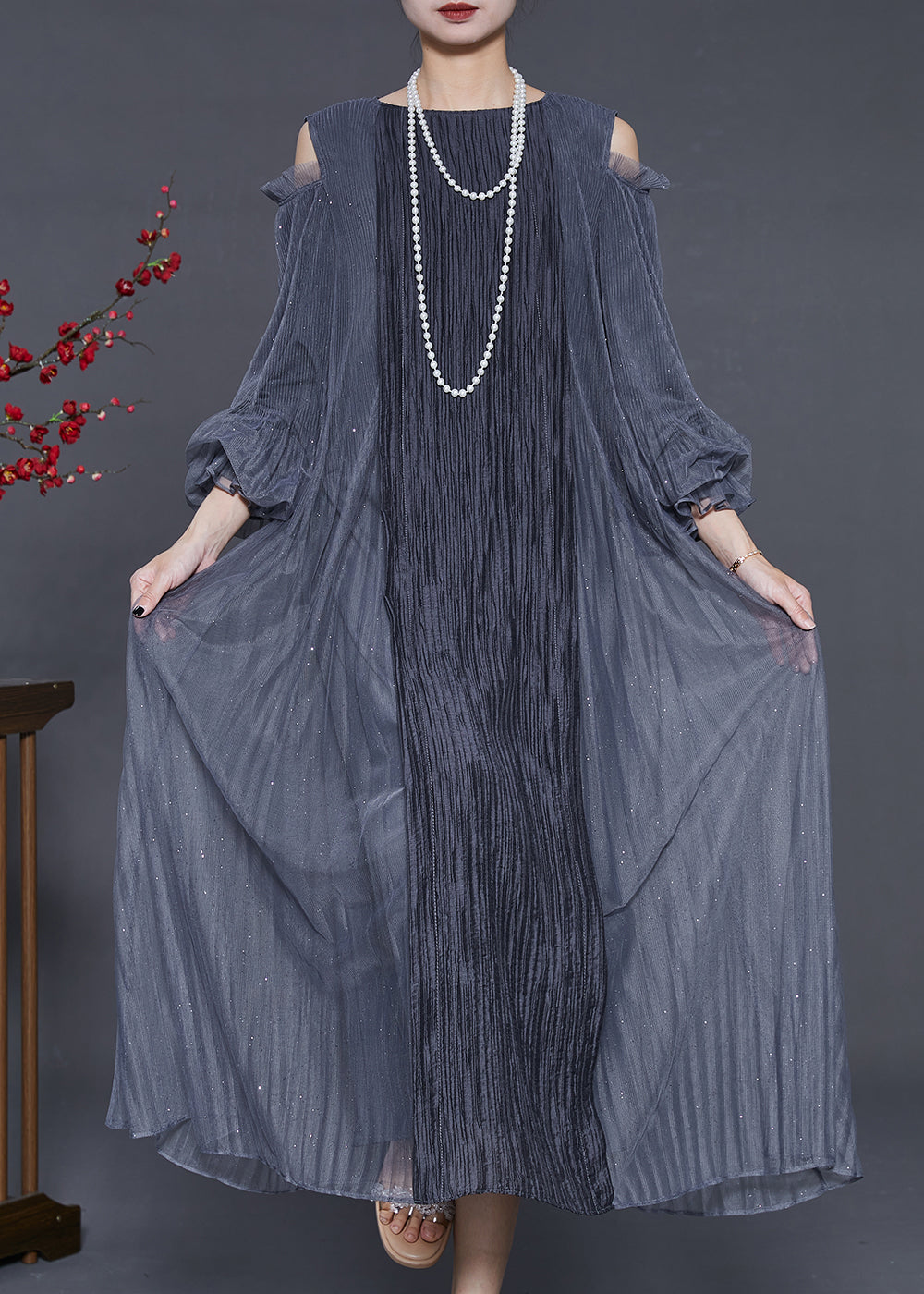 Style Grey Cold Shoulder Patchwork Wrinkled Silk Dresses Summer
