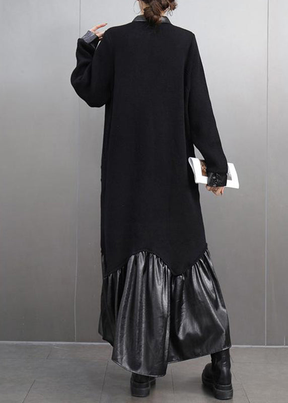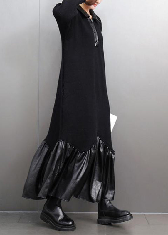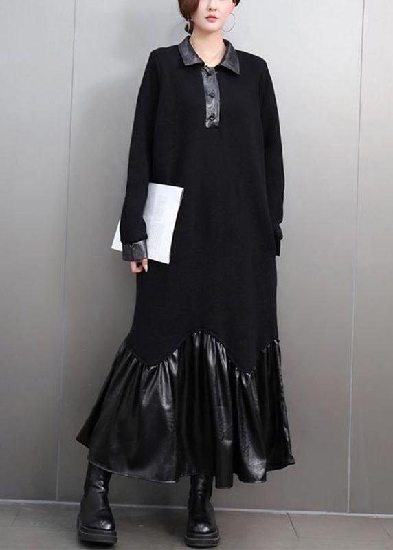 Women Black Peter Pan Collar Patchwork Button Maxi Dresses Spring