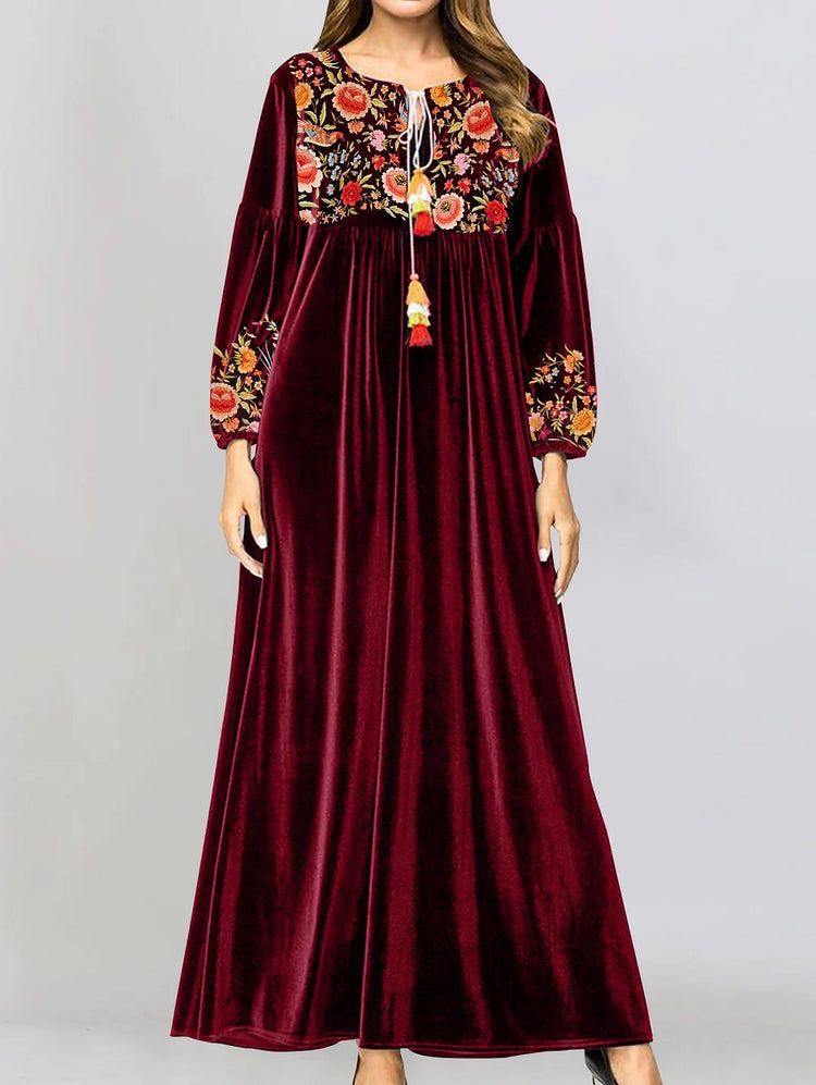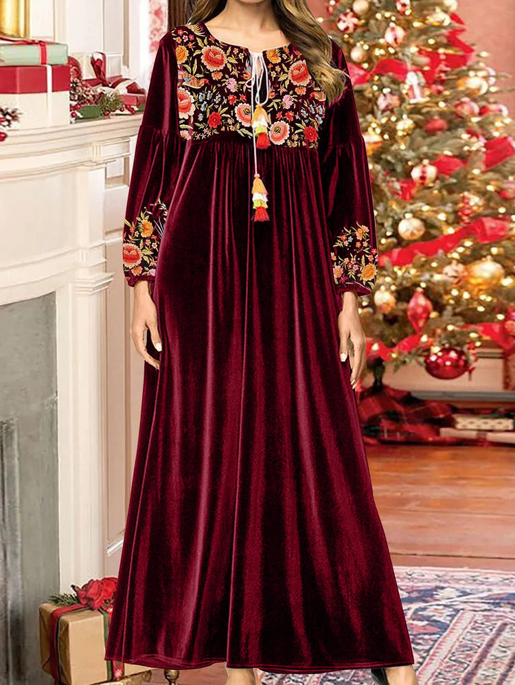 Flower Printed Panel Tassel Velvet Maxi Dress