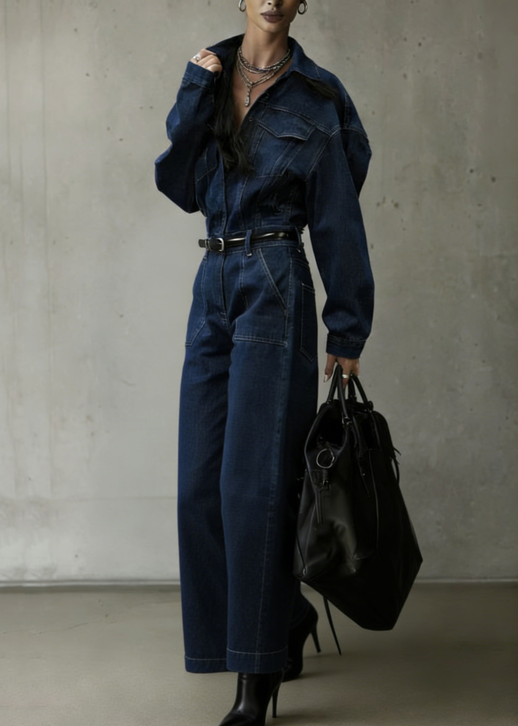 Women Navy Pockets Patchwork Denim Jumpsuits Spring