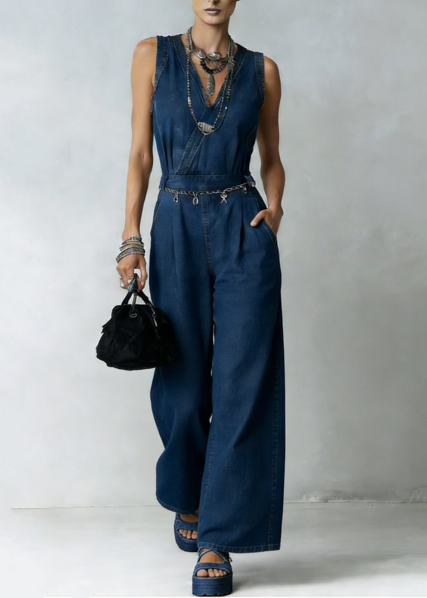 Stylish Denim Blue V Neck Tunic Sashes Jumpsuit Sleeveless
