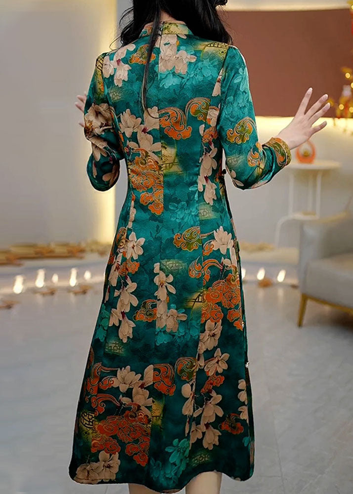 Natural Stand Collar Print High Waist Silk Long Dress Fall