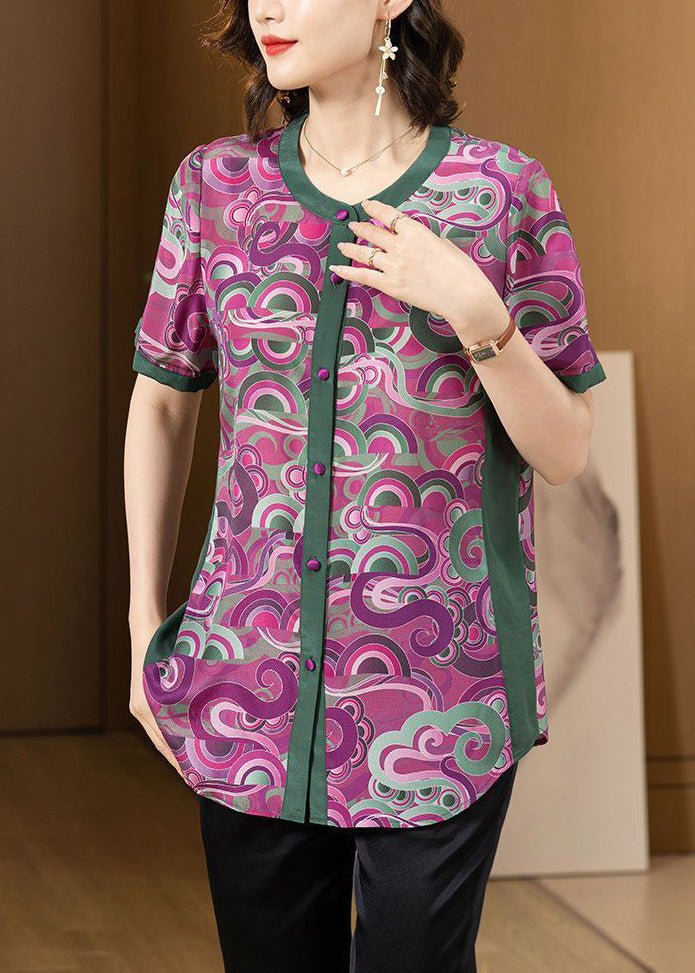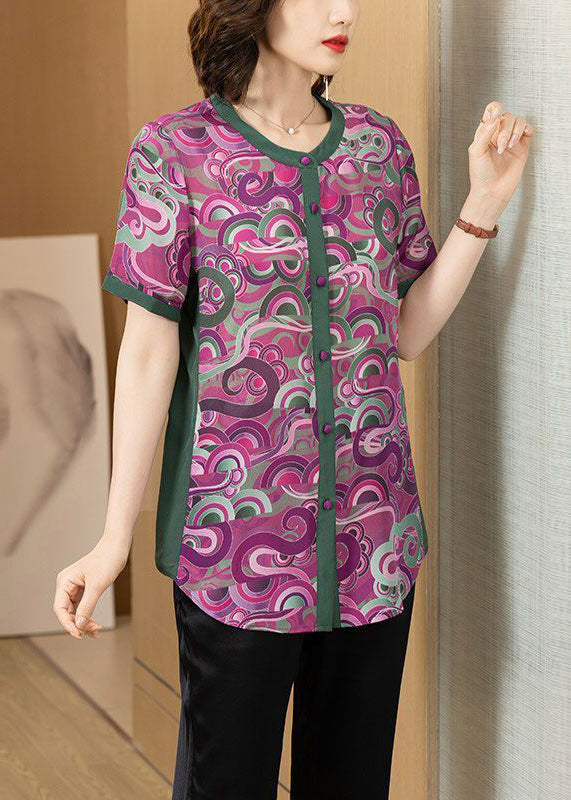 New Purple O Neck Print Button Patchwork Silk Shirt Summer