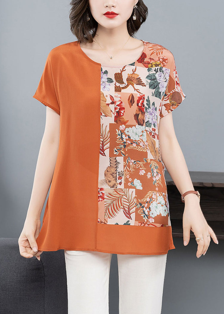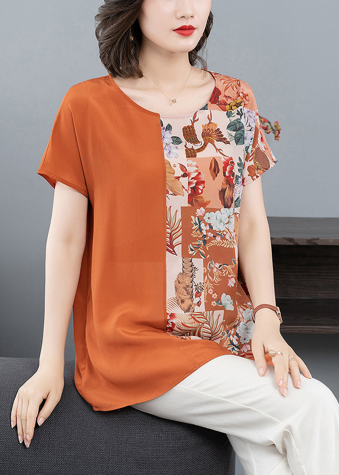 Women Orange O Neck Print Patchwork Silk T Shirt Tops Summer