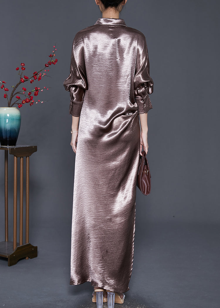Women Peter Pan Collar Side Open Silk Long Dress Fall