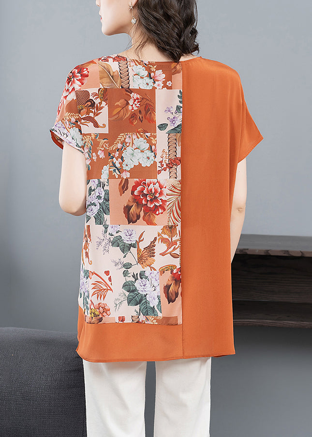 Women Orange O Neck Print Patchwork Silk T Shirt Tops Summer