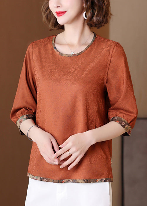 Chic Caramel O Neck Print Patchwork Silk Shirts Half Sleeve
