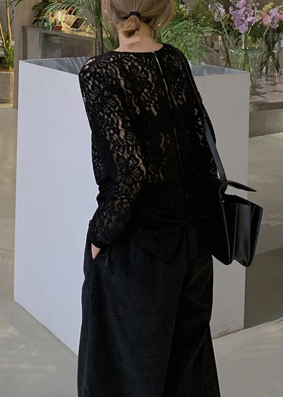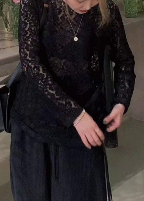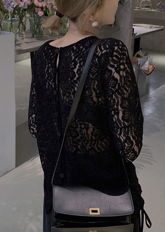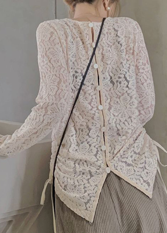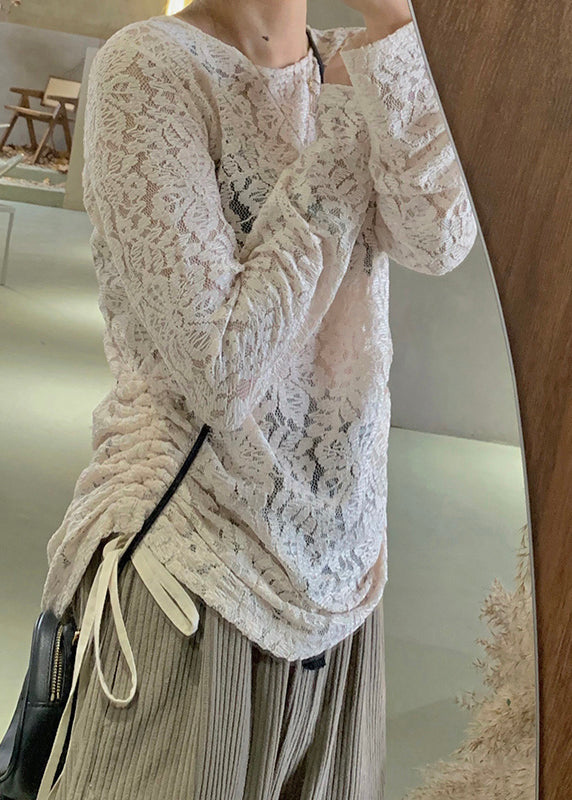 Art Apricot O-Neck Patchwork Drawstring Silk Velour Lace Top Long Sleeve