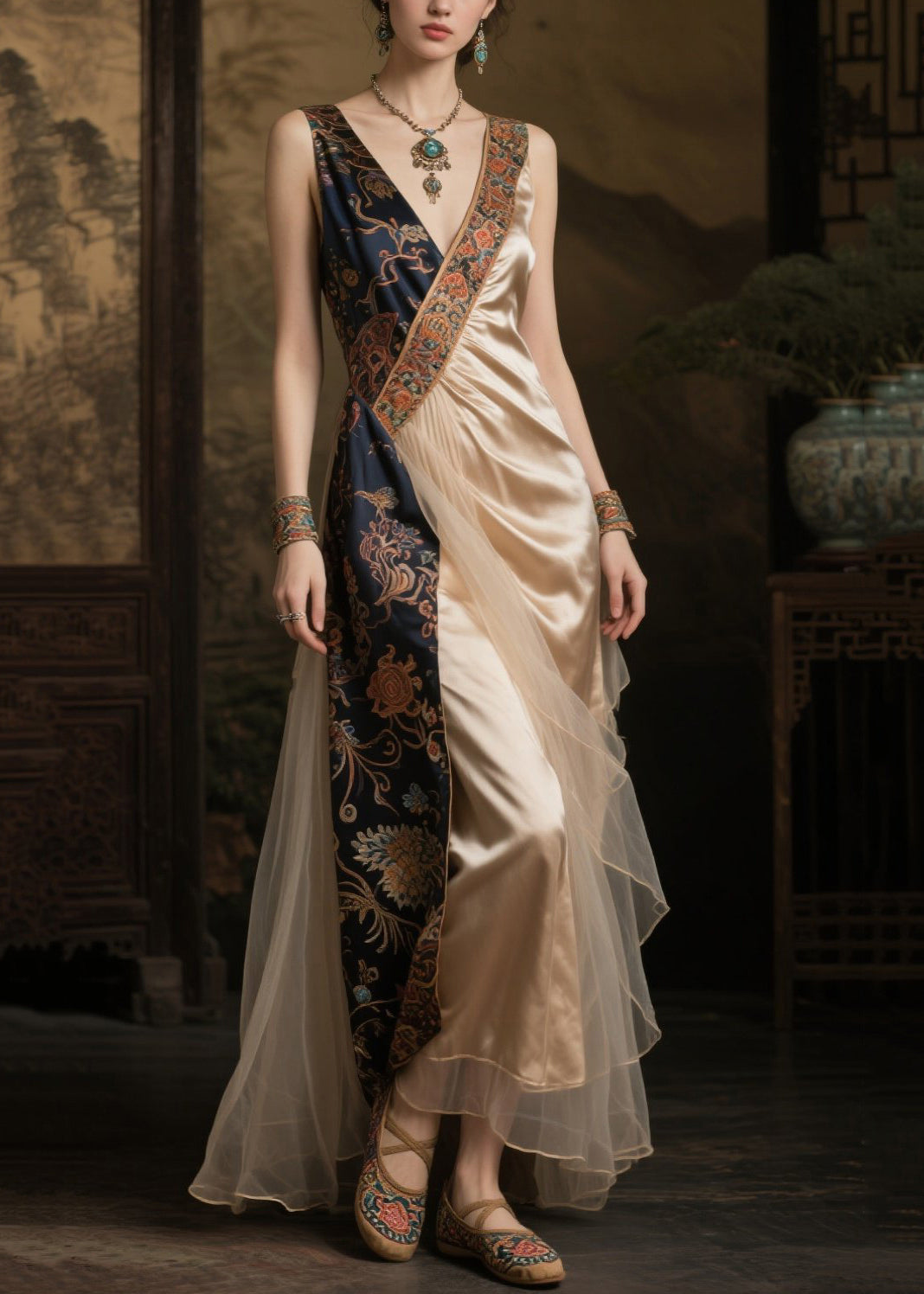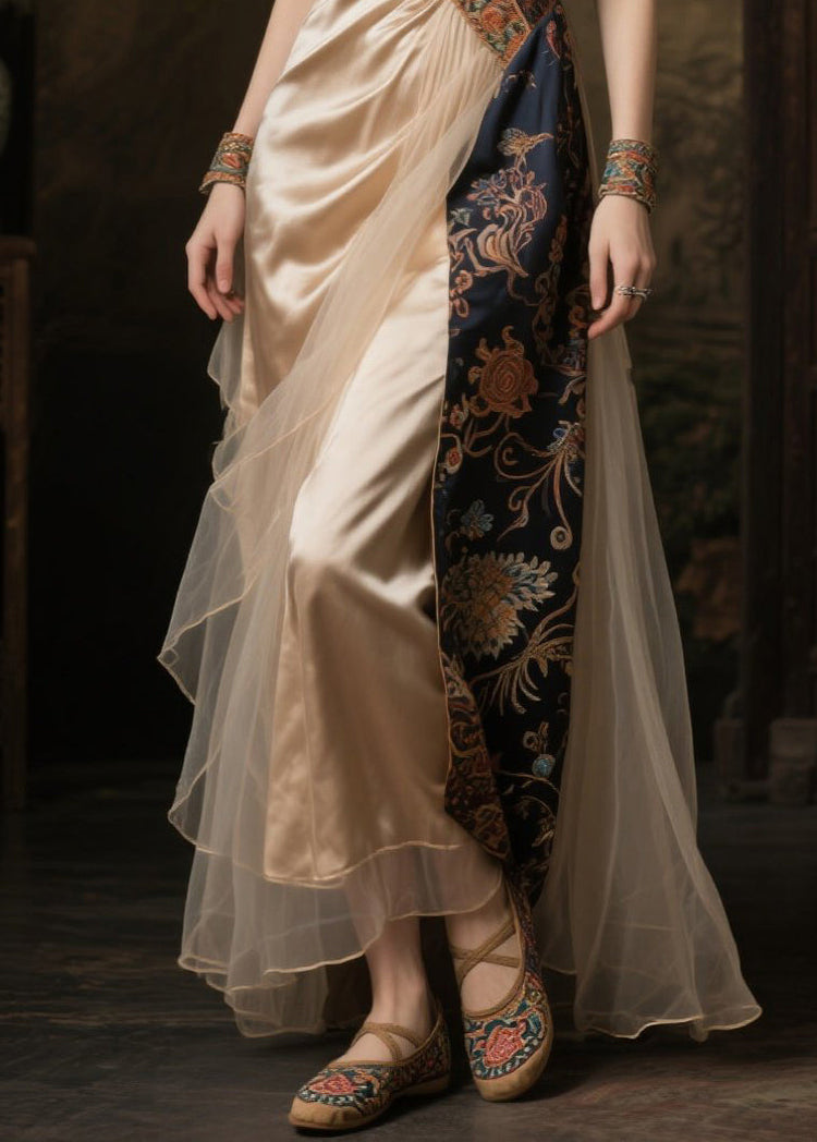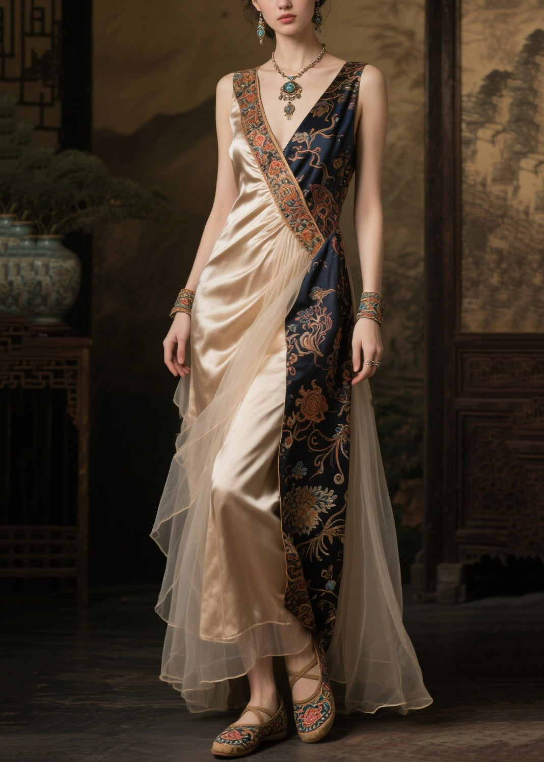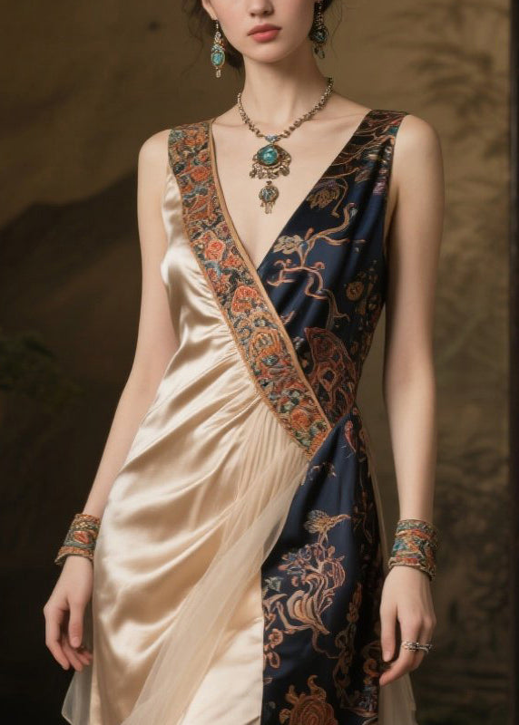 Art Champagne Asymmetrical Patchwork Silk Dinner Dress Summer