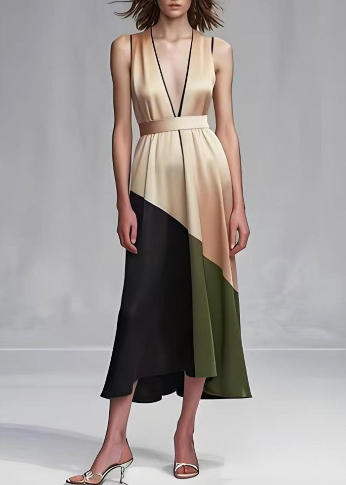 Beautiful Khaki Cinched Patchwork Silk Robe Dresses Summer