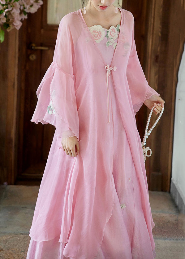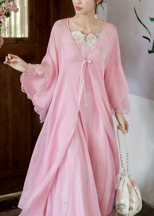 Beautiful Pink Embroidered Cardigan And Spaghetti Strap Dress Silk Two Pieces Set Flare Sleeve