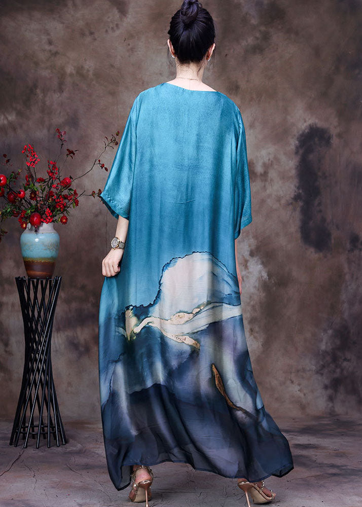 Bohemian Blue O-Neck Layered Design Print Silk Dresses For Women Bracelet Sleeve