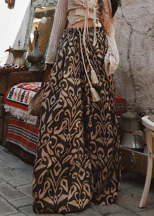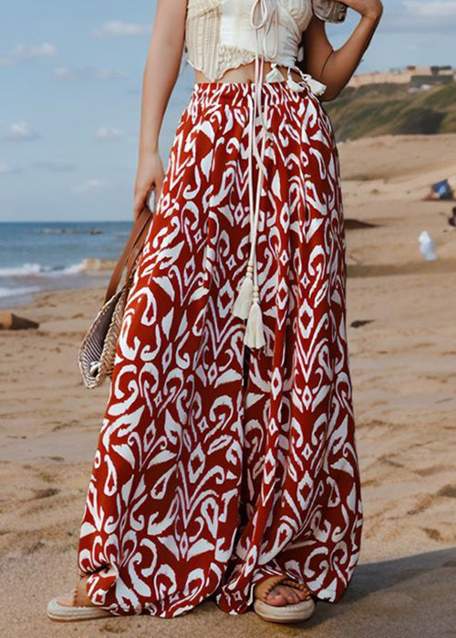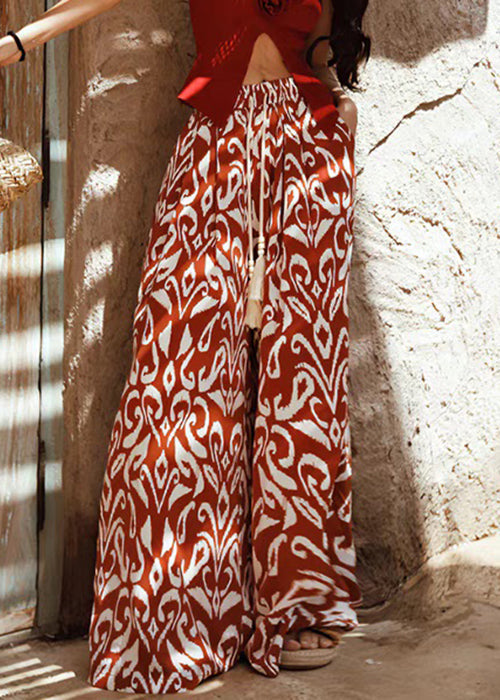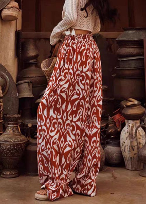 Bohemian Red Print Elastic Waist Silk Pants Summer