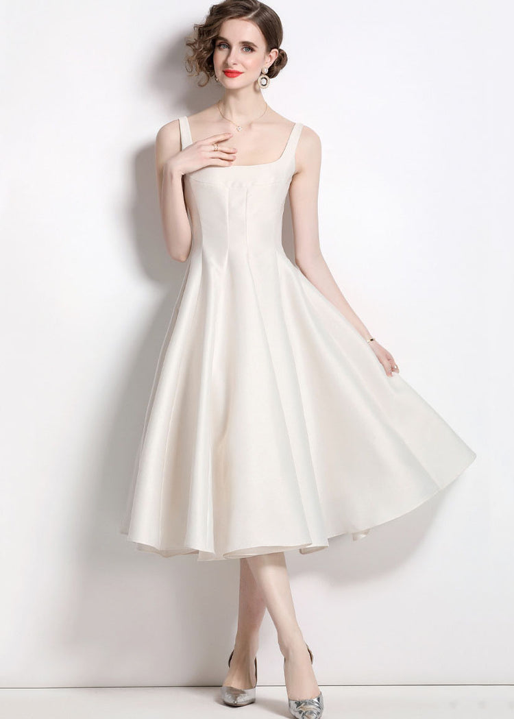 Boutique Apricot Square Collar Wrinkled Patchwork Silk Dress Sleeveless