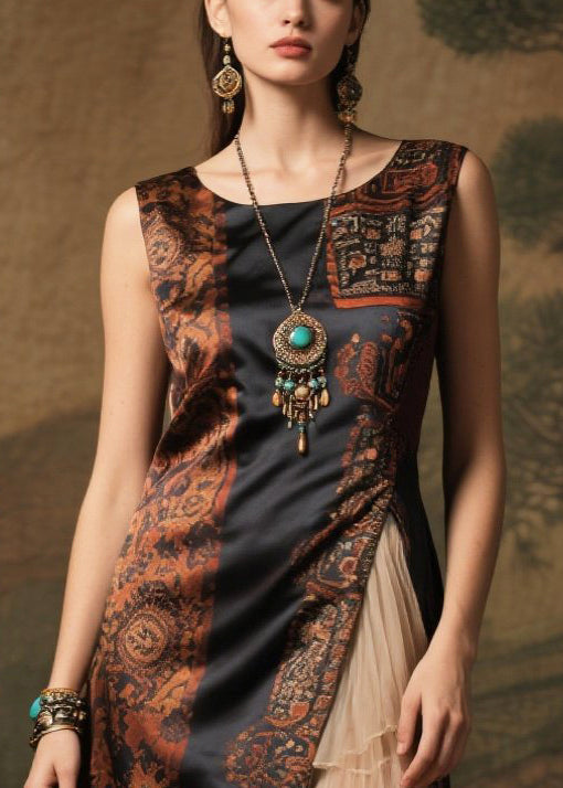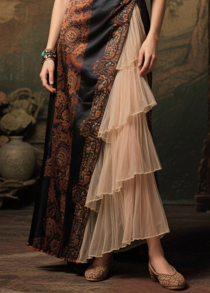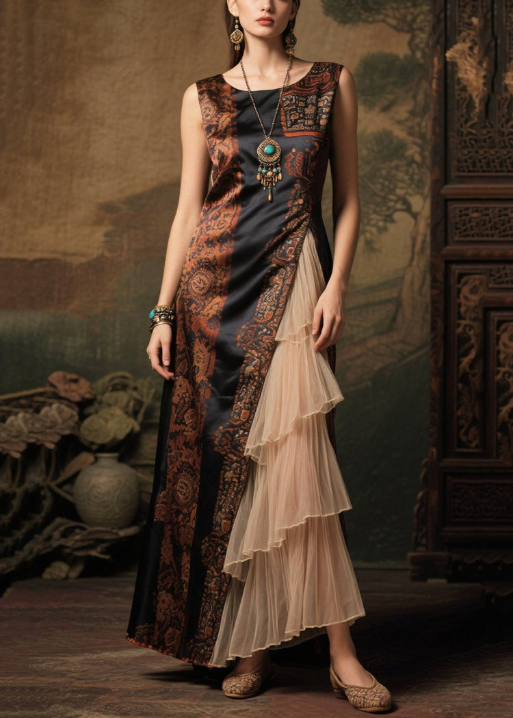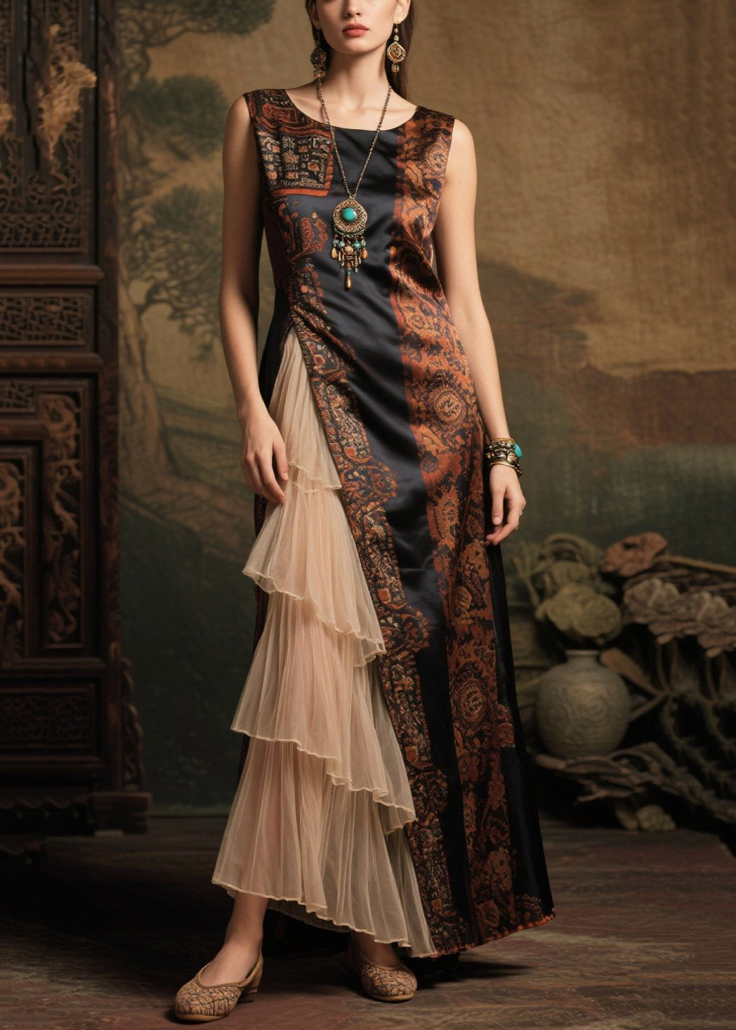 Boutique Black Print Ruffles Patchwork Silk Evening Dresses Sleeveless