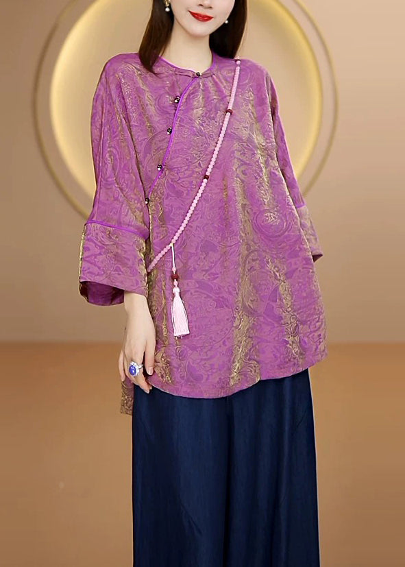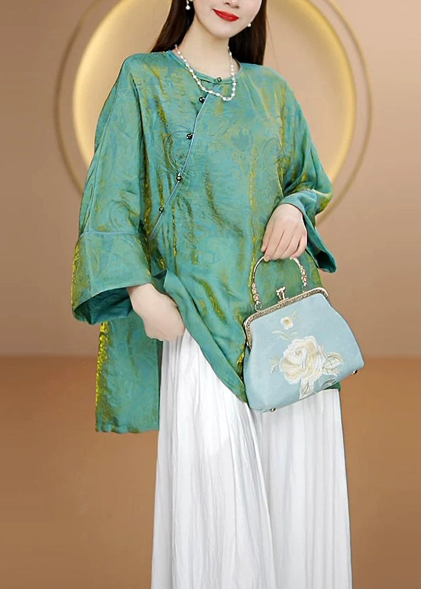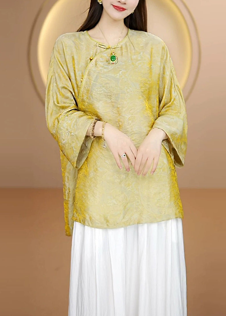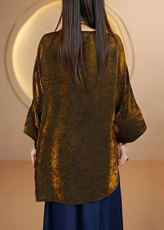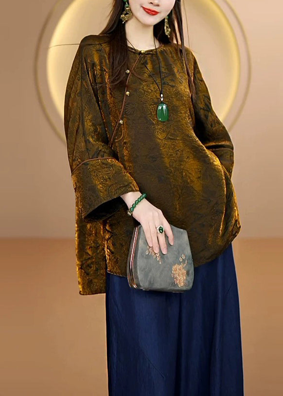 Boutique Coffee O Neck Button Patchwork Silk Tops Fall