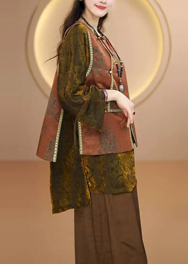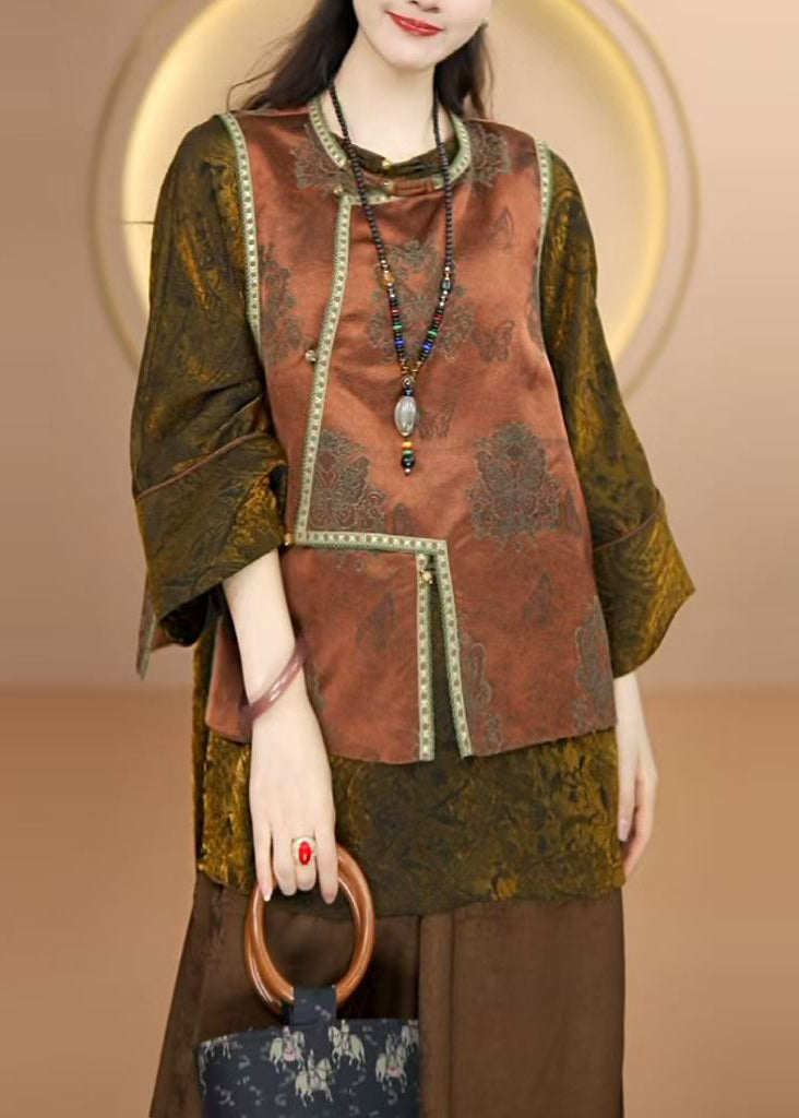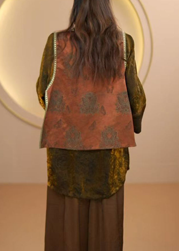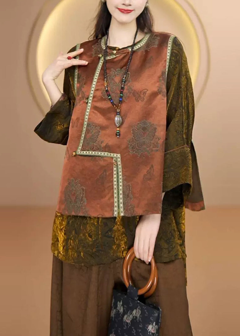 Boutique Coffee O Neck Jacquard Patchwork Silk Vest Sleeveless