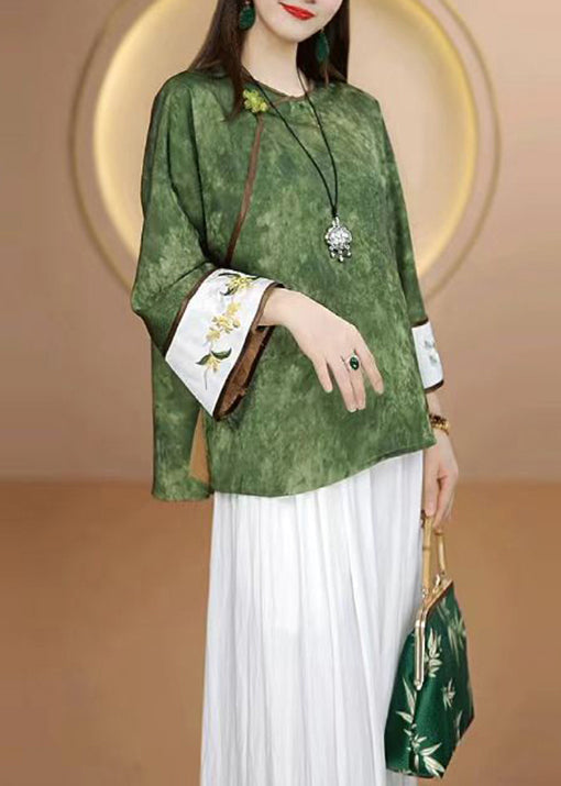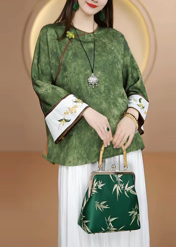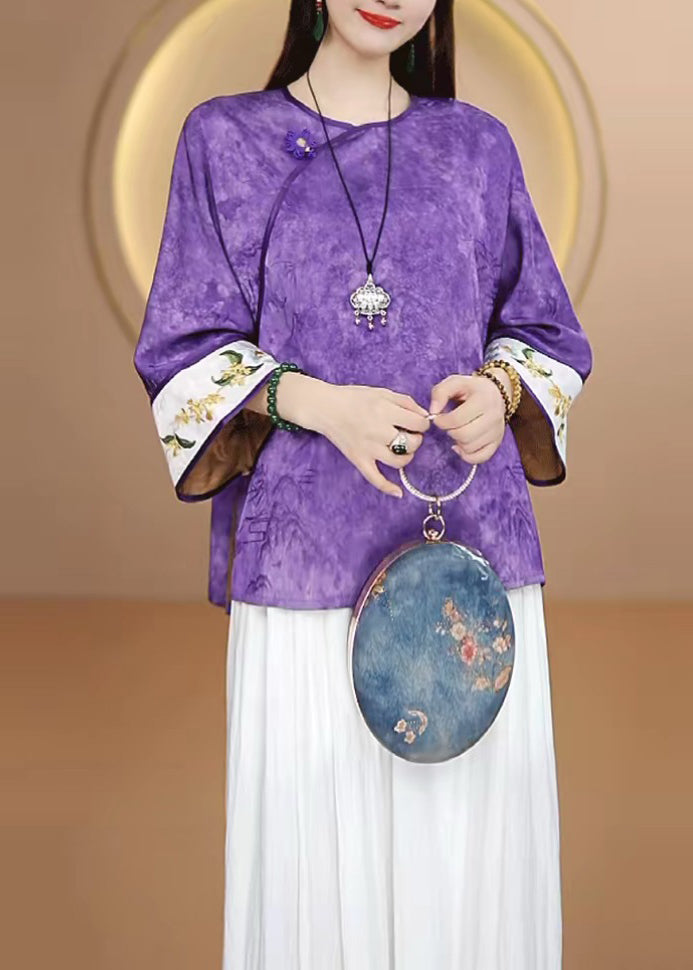 Boutique Purple O Neck Embroidered Patchwork Silk Blouses Fall
