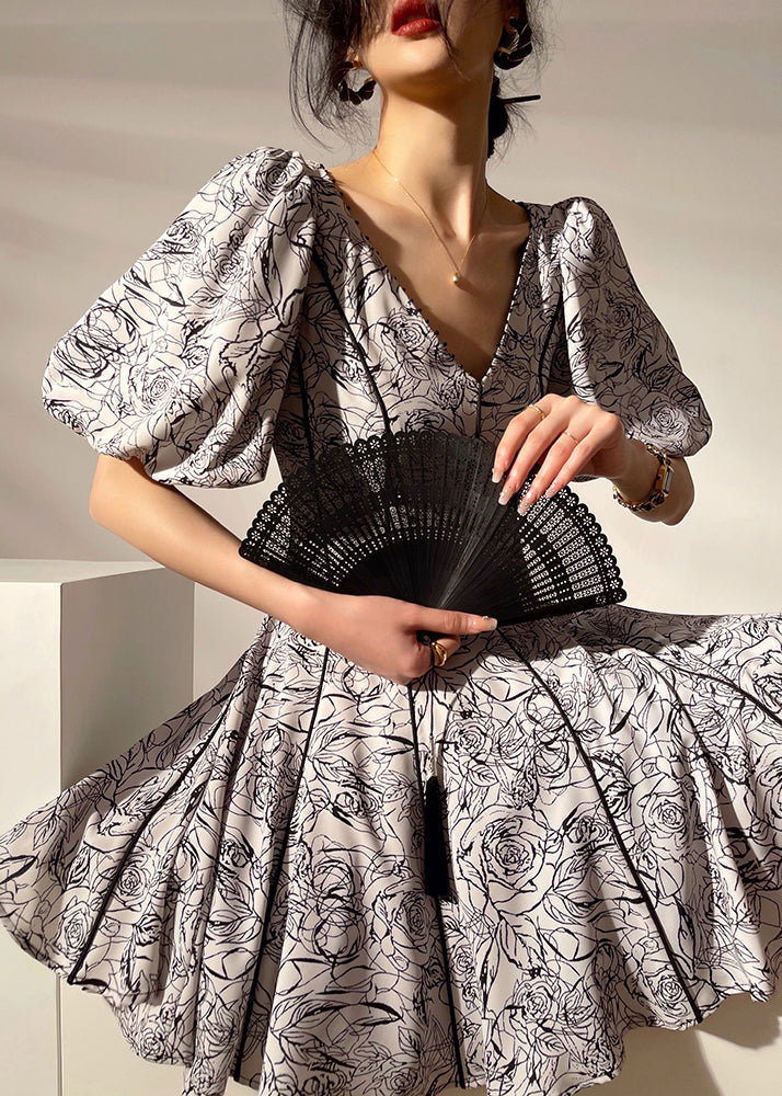 Boutique V Neck Print Nail Bead Silk Mid Dress Short Sleeve