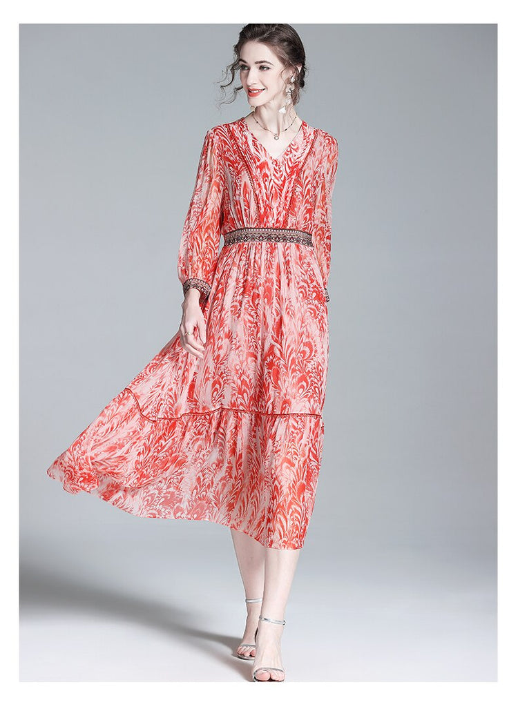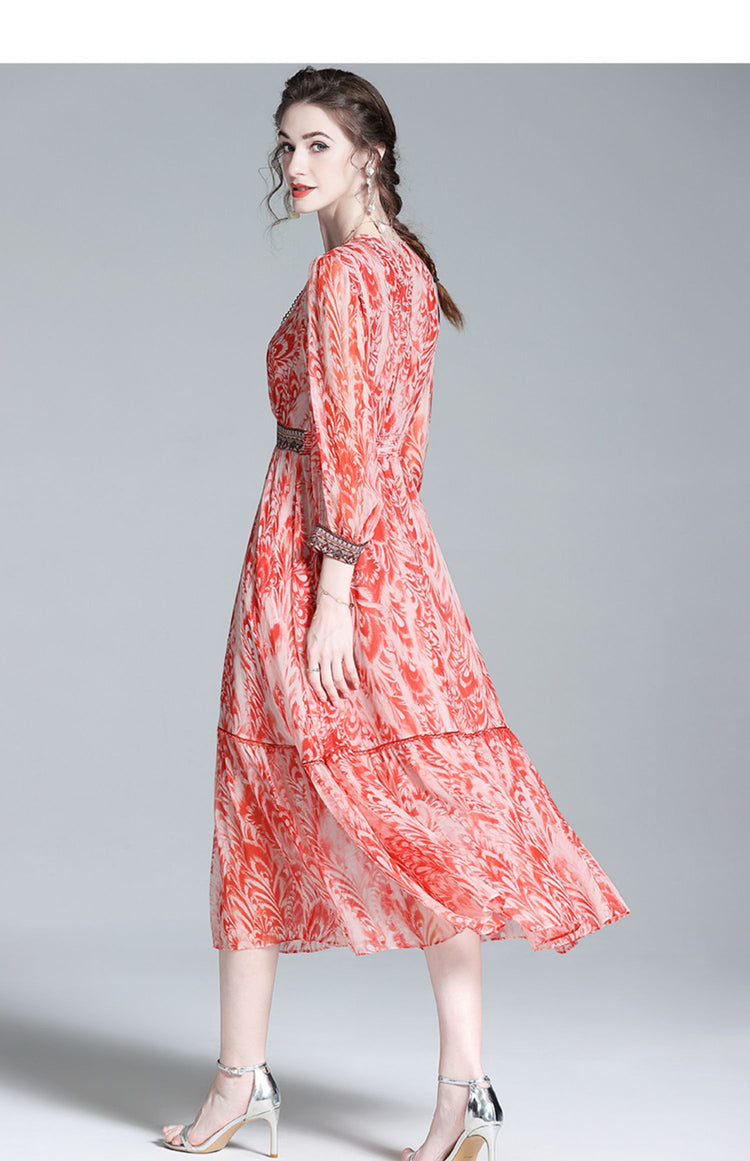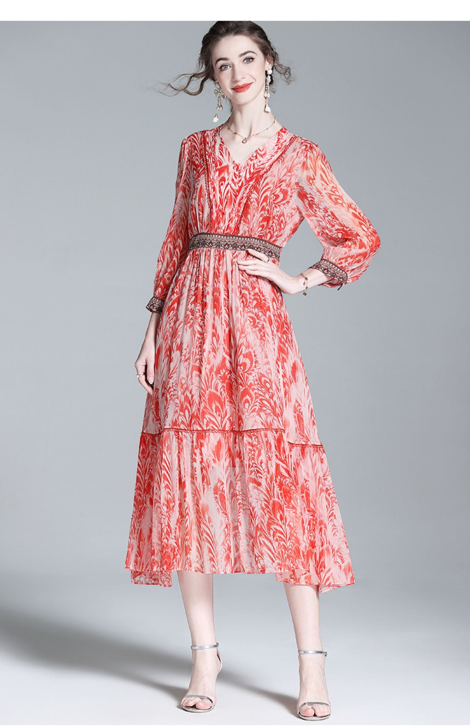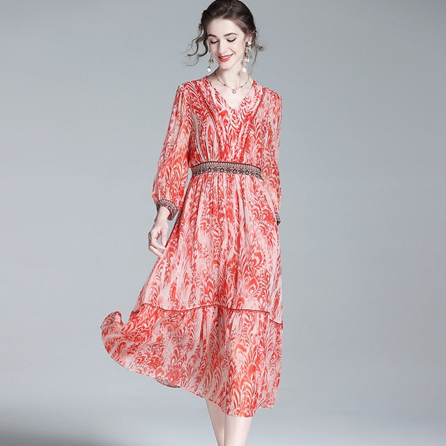 Casual Embroidery Floral Silk Ruffled V-Neck Midi Dress