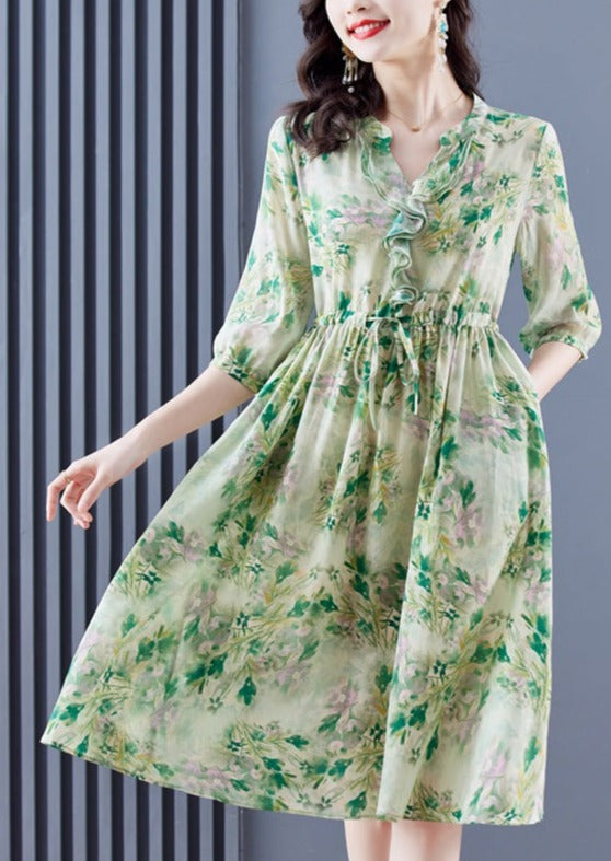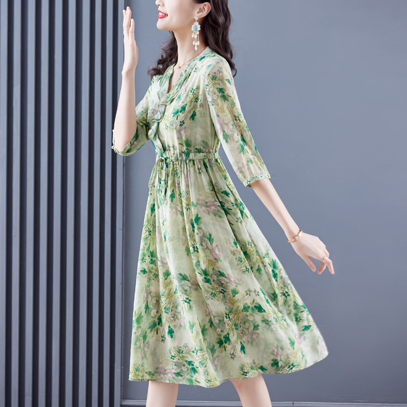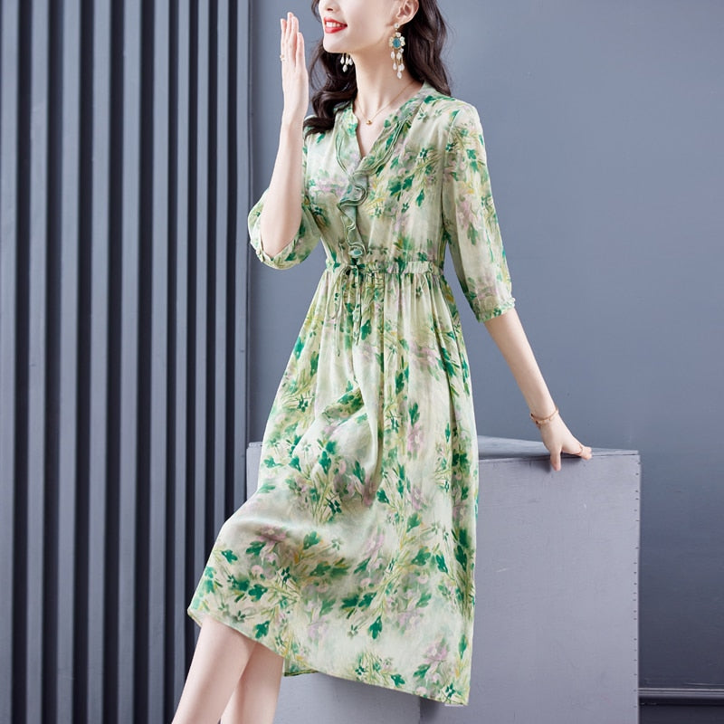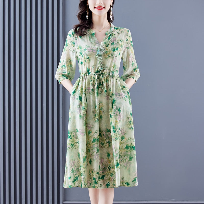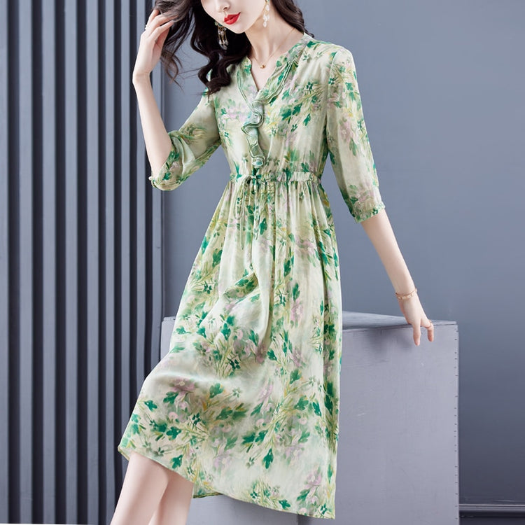Casual Floral Silk Chic Ruffled V-Neck Midi Dress