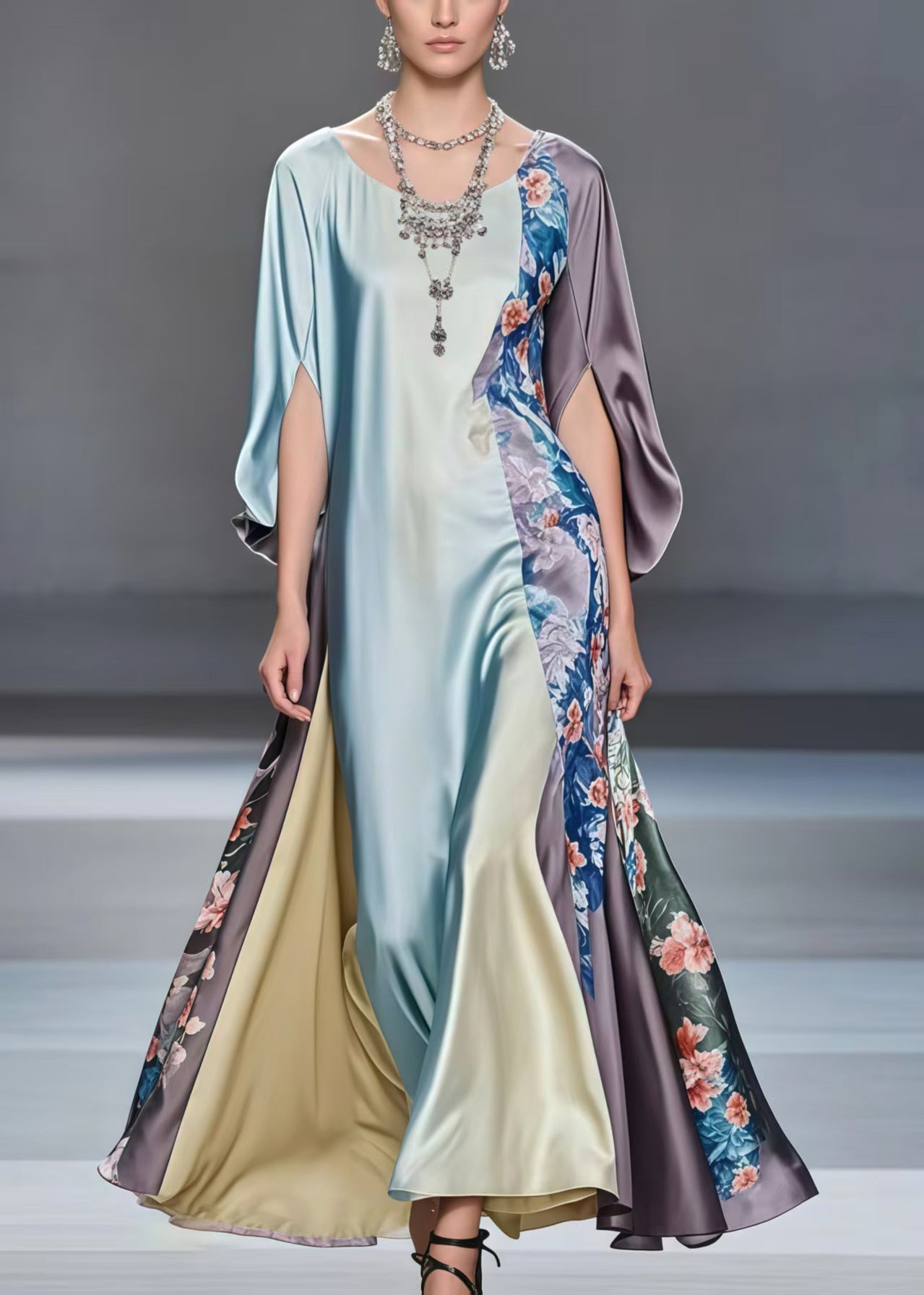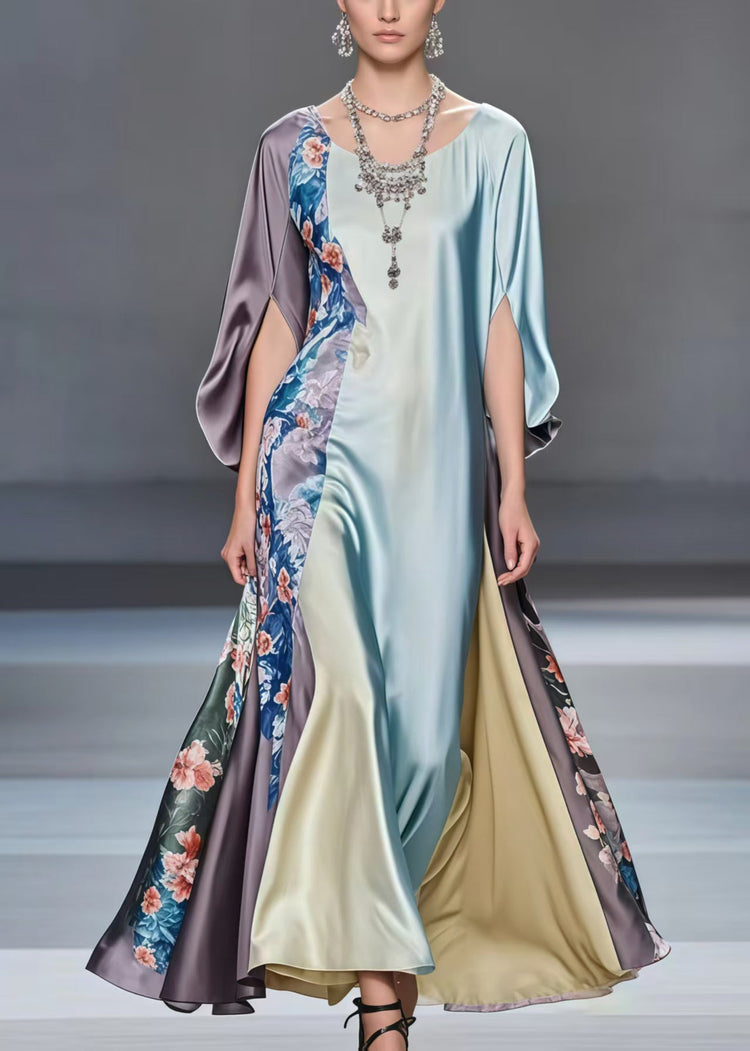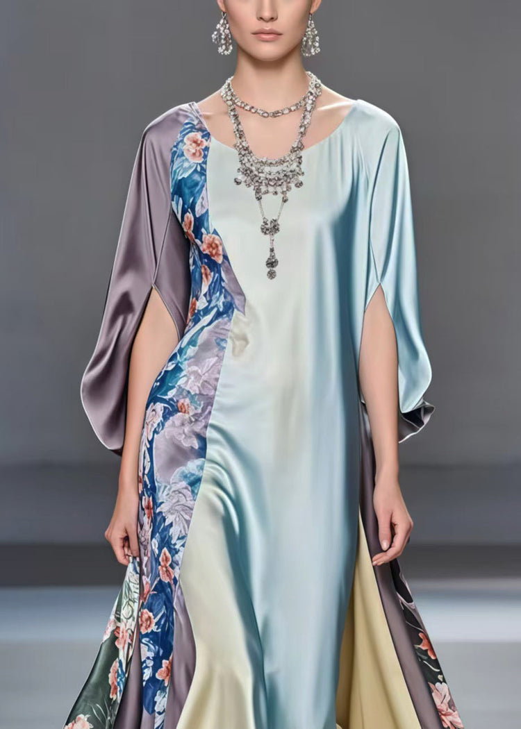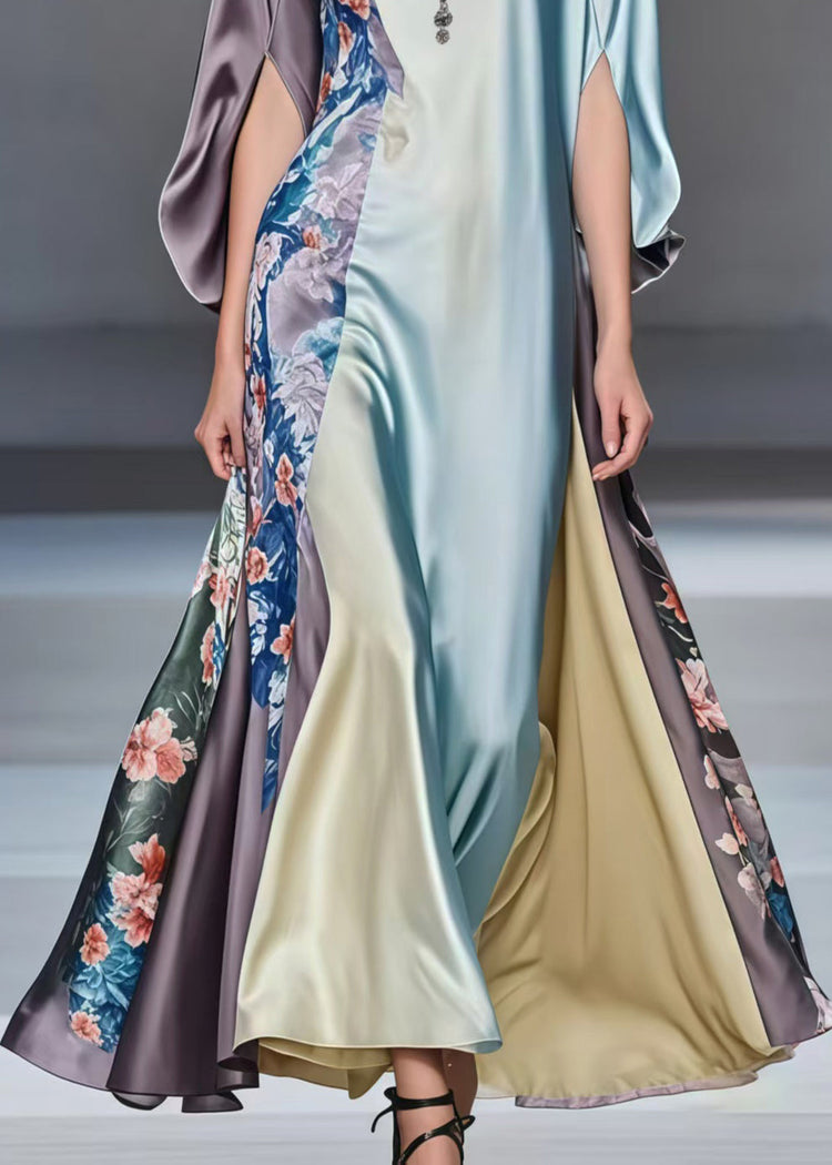 Casual Multicolour Patchwork Exra Large Hem Silk Dress Batwing Sleeve
