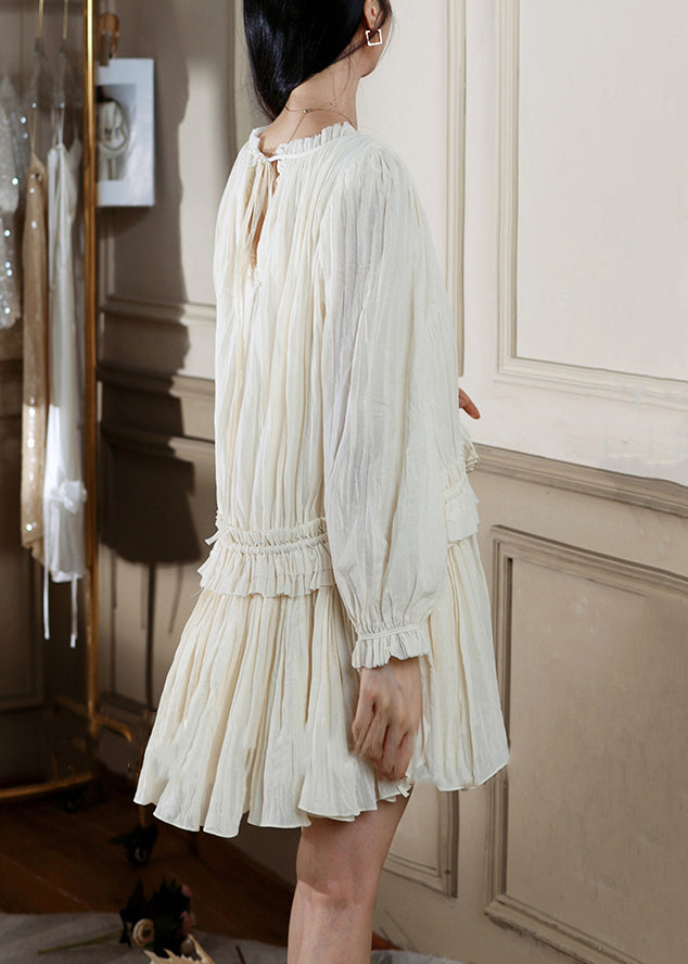 Chic Apricot Wrinkled Lace Up Silk Cotton Mini Dress Fall